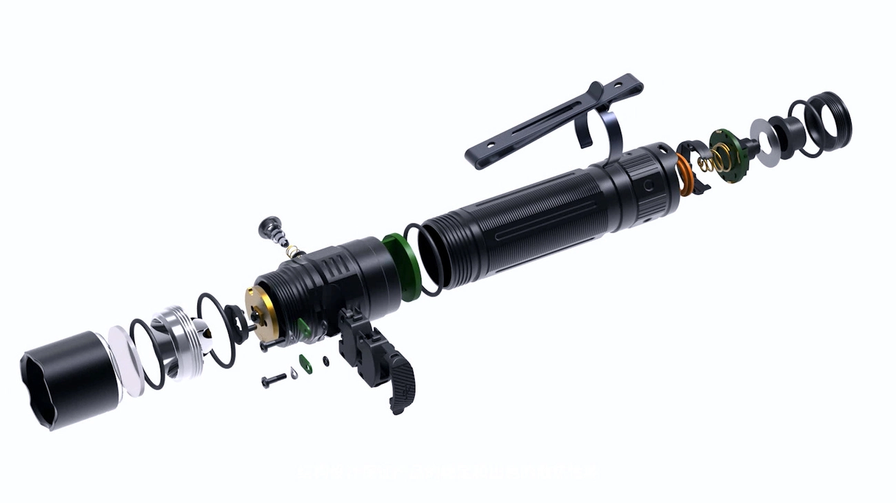 Управляется этот фонарь по стандартному принципу 2 кнопками: тактической и функциональной. Для его работы потребуется 1 аккумулятор формата 21700. В комплекте уже есть фирменный элемент питания емкостью 5000 мАч. Он рассчитан по меньшей мере на 500 циклов перезарядки и может заряжаться через кабель USB type-C непосредственно внутри батарейного отсека. А чтобы пользователь всегда был в курсе актуального состояния аккумулятора, в фонарь встроен индикатор. Он включается автоматически на 3 секунды при каждом включении фонаря и работает исключительно с фирменным аккумулятором. Если индикатор светится равномерным зеленым светом, значит аккумулятор заряжен на 75%-100%. Если зеленый свет мигает, значит осталось 50%-75% заряда. Когда индикатор равномерно светится красным, элемент питания заряжен на 25%-50%. Если красный свет мигает, заряда осталось менее 25%.