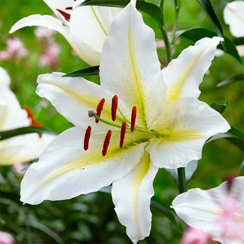 Лилии ориентальные (восточные) Baferrari относятся к гибридным разновидностям семейства Лилейных, купить луковицы можно для украшения сада, а также для создания букетов. Цветки лилии повернуты в стороны, имеют белый цвет с контрастной желтой линией по центру и красно-коричневыми пыльниками. Растение прямостоячее с темно-зелеными листьями, которые красиво оттеняют белоснежные цветы Баферрари