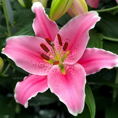 Лилия ориентальная Sorbonne - бесподобное по своей красоте цветущее растение, которое нашло широкую популярность на всей территории Украины. Используется для украшения приусадебных участков и для формирования букетных композиций. Стебель цветка высокий и крепкий, а на нем могут располагаться до 10 соцветий, лепестки окрашены в насыщенно-розовый цвет, с незначительным красным крапом.