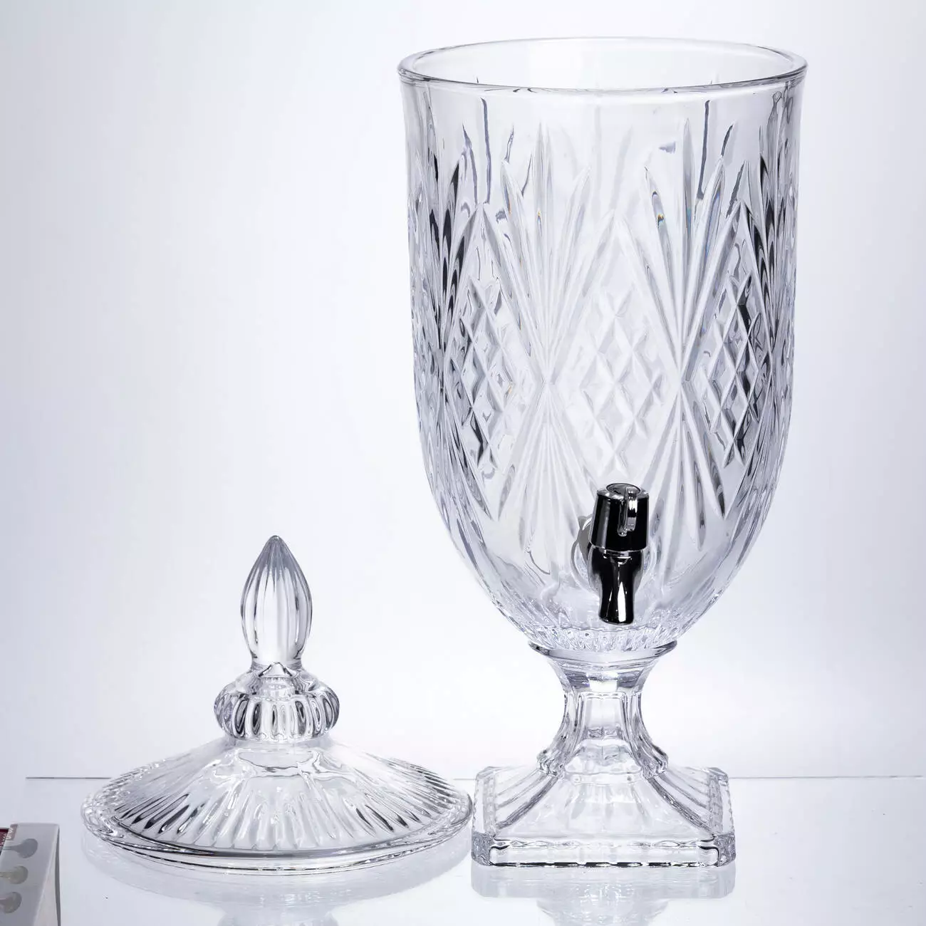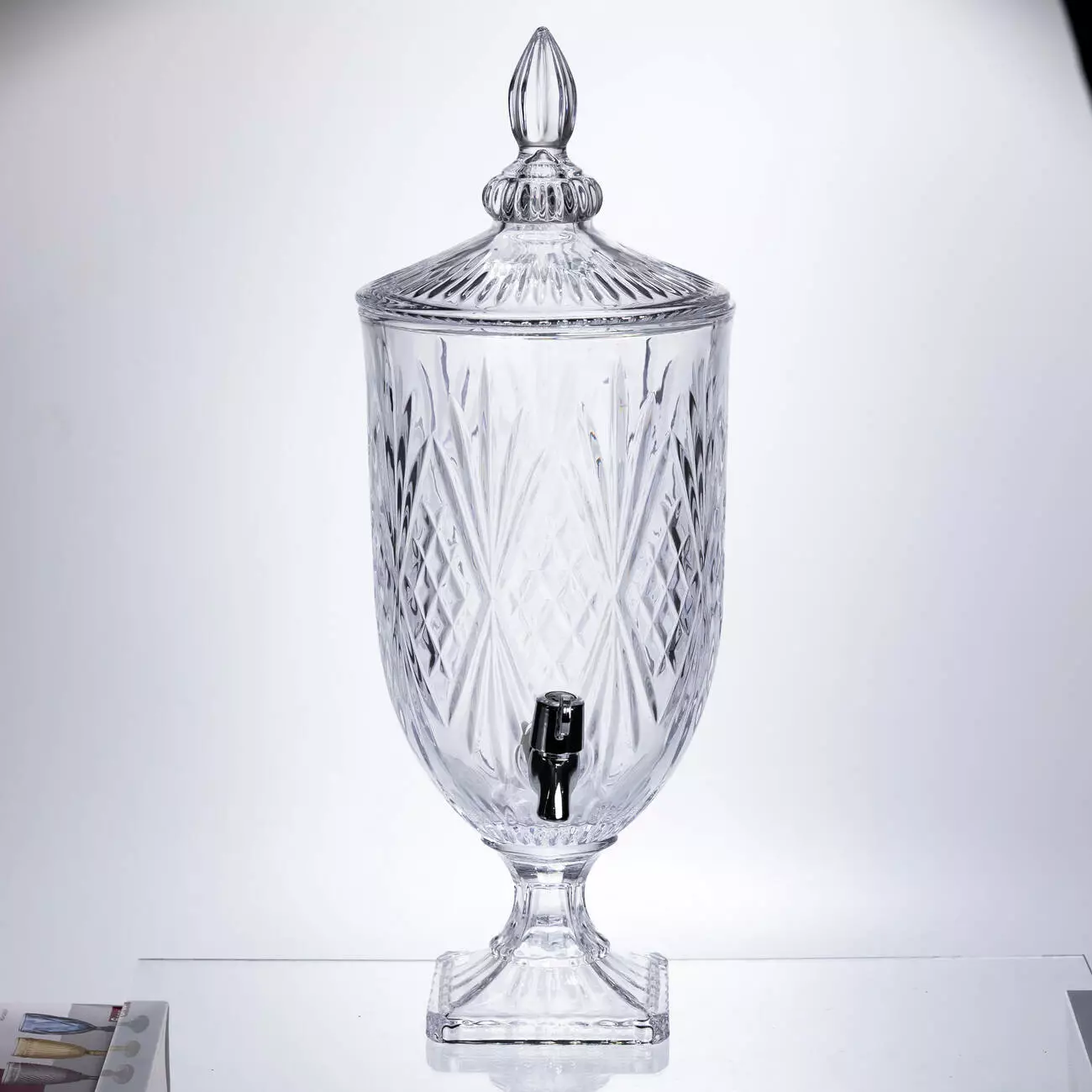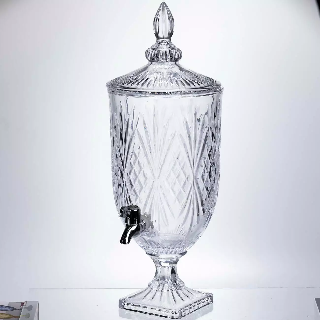Естетичний диспенсер великого об'єму із прозорого скла. Завдяки класичнрму алмазному ограновуванні та значному розміру, він стане головним елементом сервірування на будь-якому великому заході, забезпечуючи гостей напоями на весь вечір.