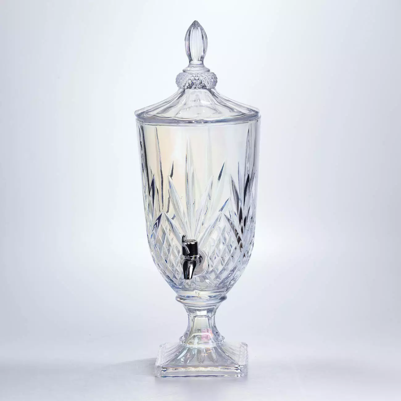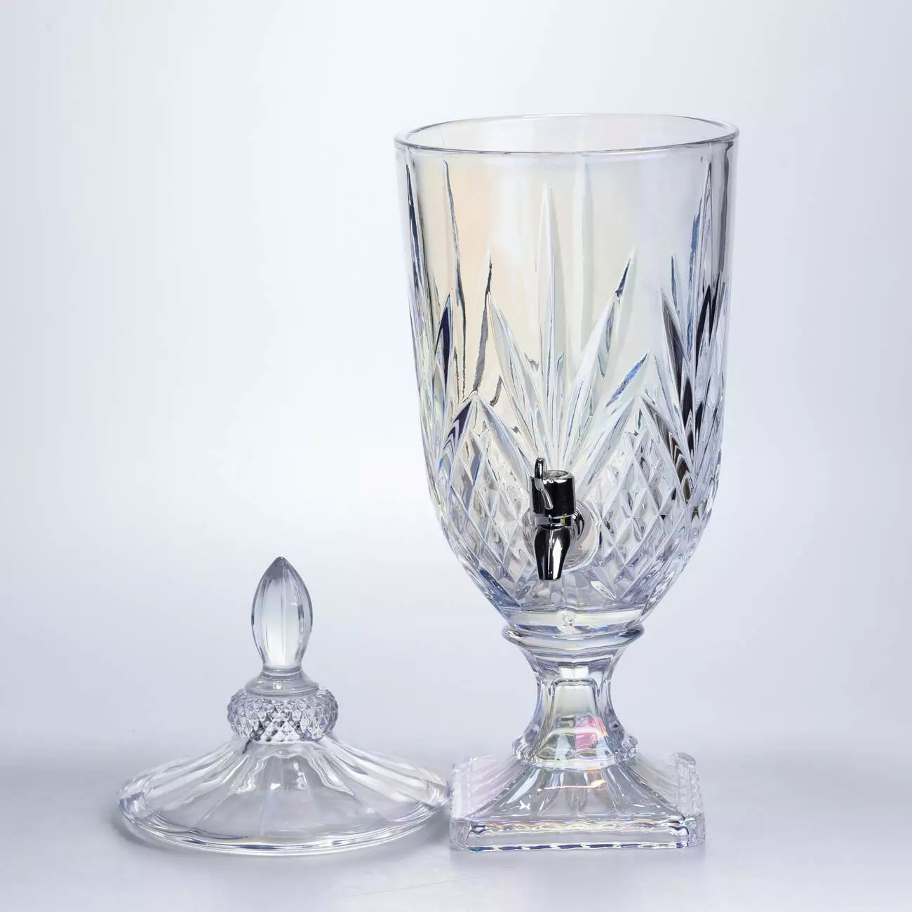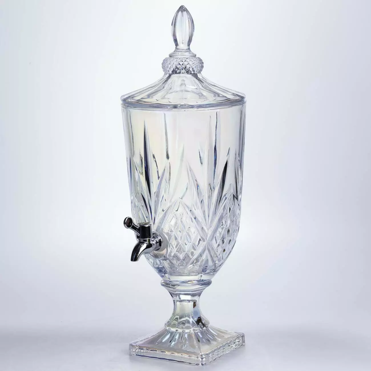 Розкішний диспенсер зі скла з перламутровим напиленням, що створює м'який райдужний перелив при кожному русі світла. Поєднання класичної форми та сучасного перлинного сяйва робить цю лимонадницю справжнім арт-об'єктом для кухні чи святкового столу.
