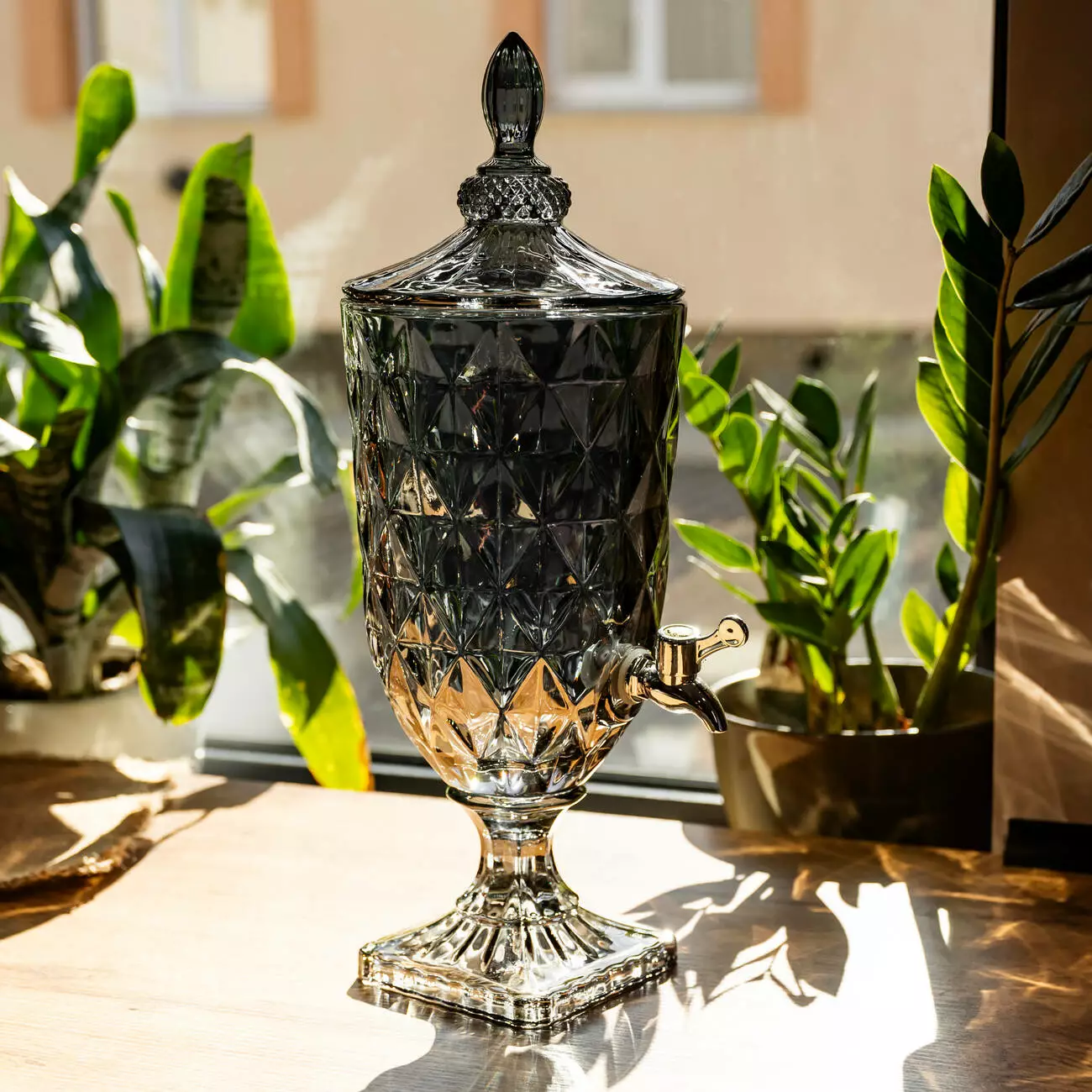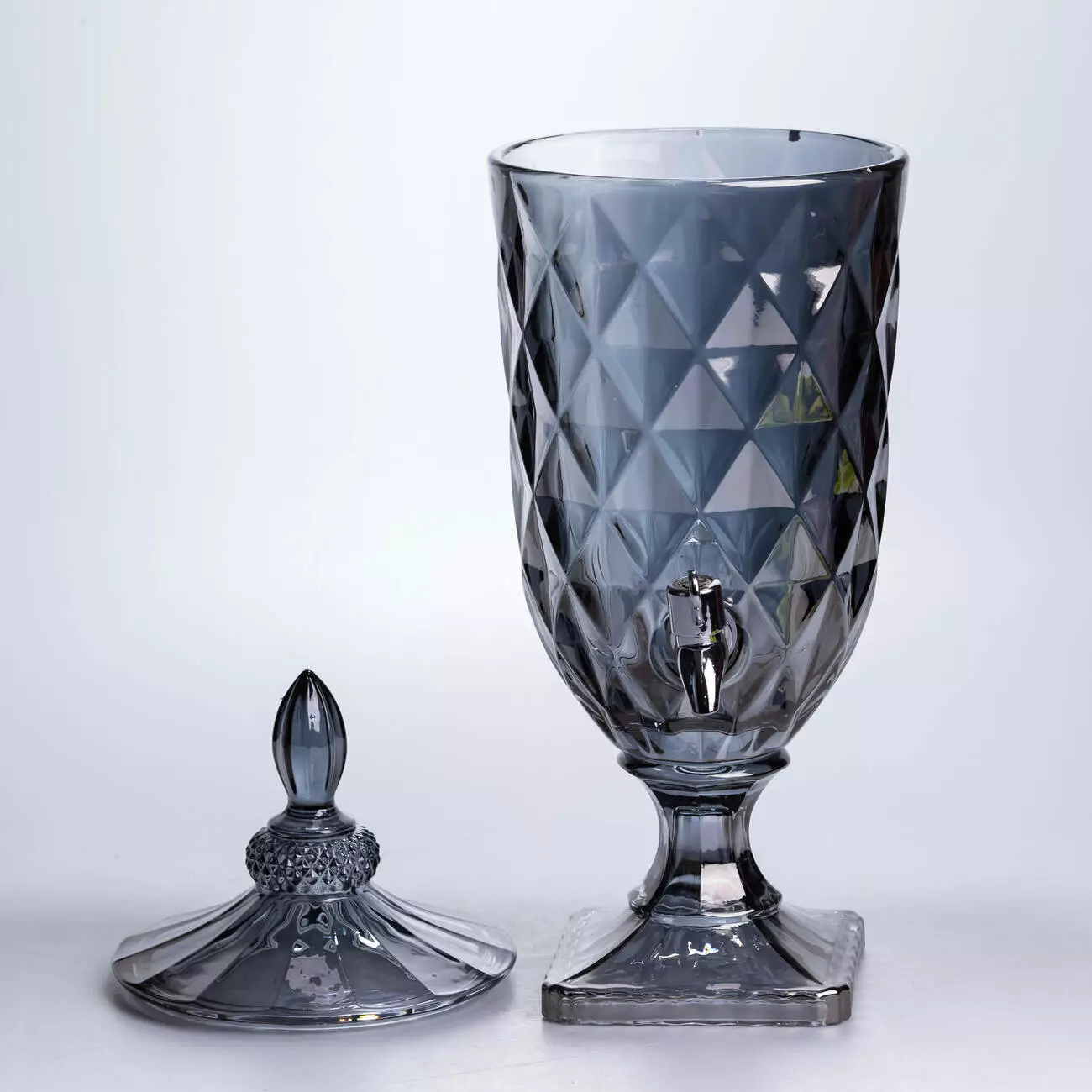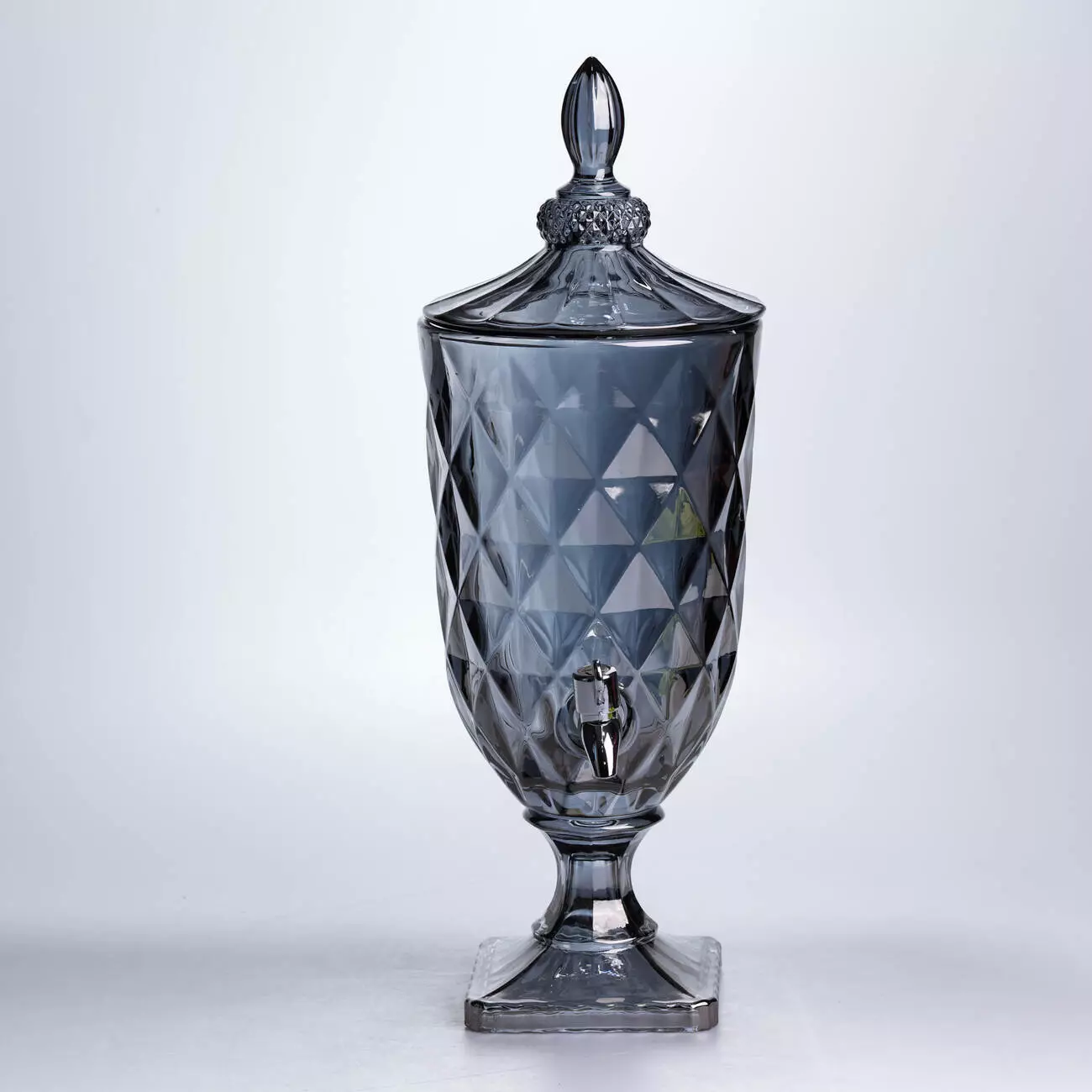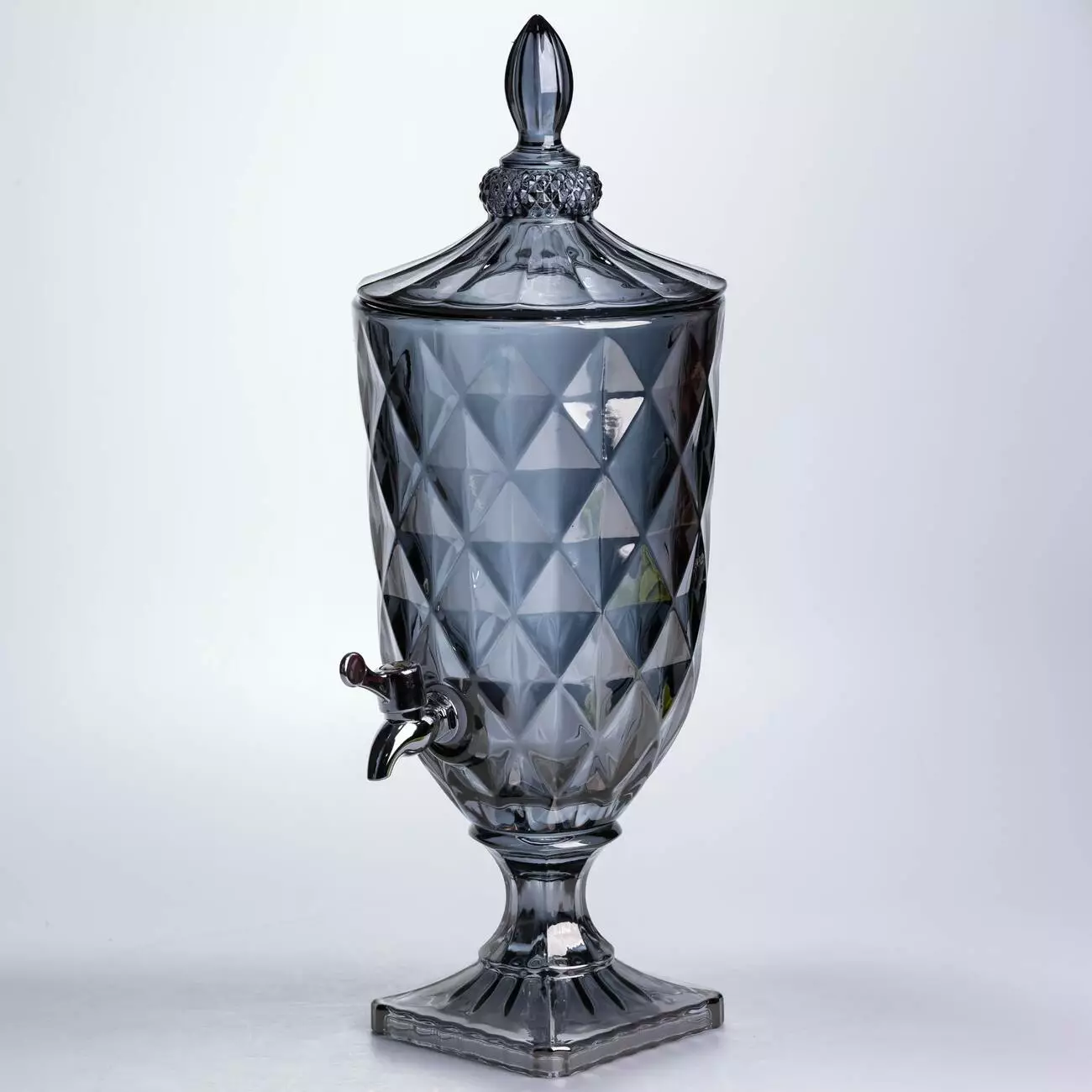 Диспенсер із щільного тонованого скла у глибокому графітовому відтінку. Поєднання суворого кольору та класичного алмазного огранювання перетворює цю лимонадницю на стильний акцент сучасної кухні або статусну прикрасу святкового фуршету.