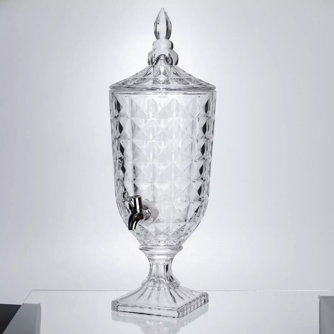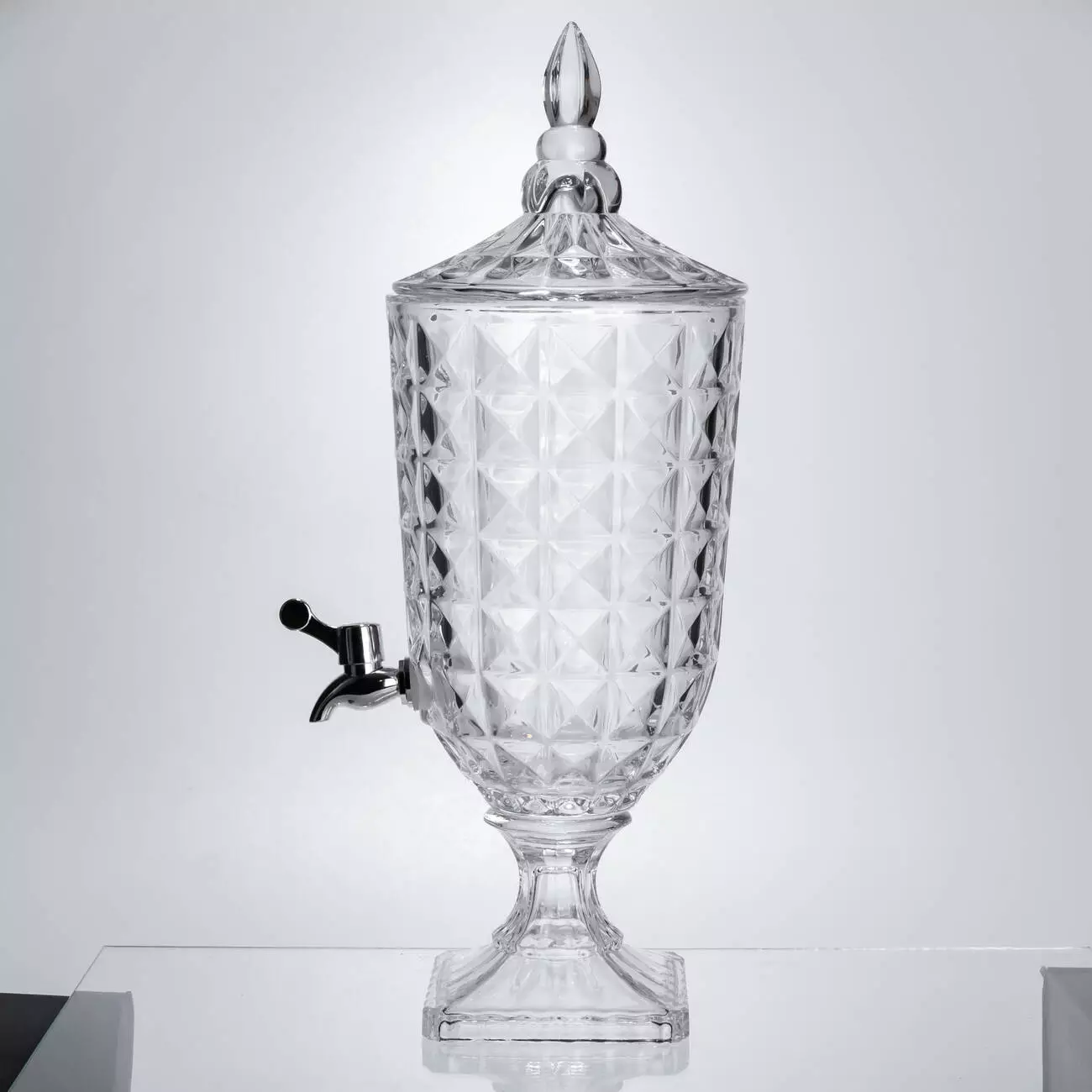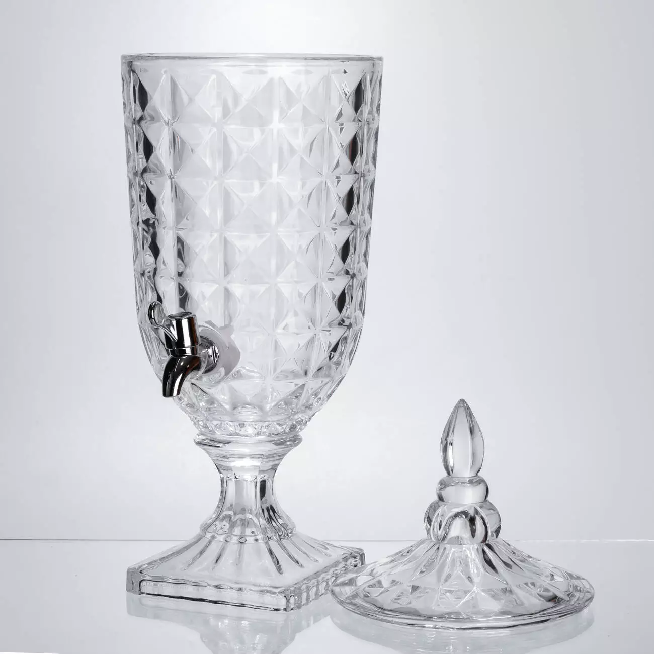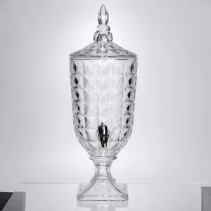Лимонадниця на ніжці з краном стане практичним аксесуаром для подачі напоїв вдома або на святковому столі. Виготовлена з товстого скла під кришталь, вона поєднує міцність і декоративний вигляд. Завдяки рельєфному візерунку напій у ній виглядає привабливо та апетитно.