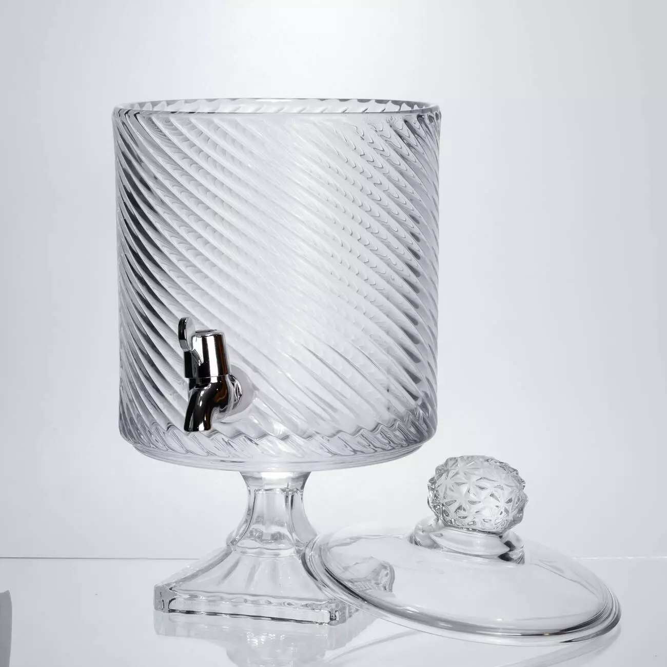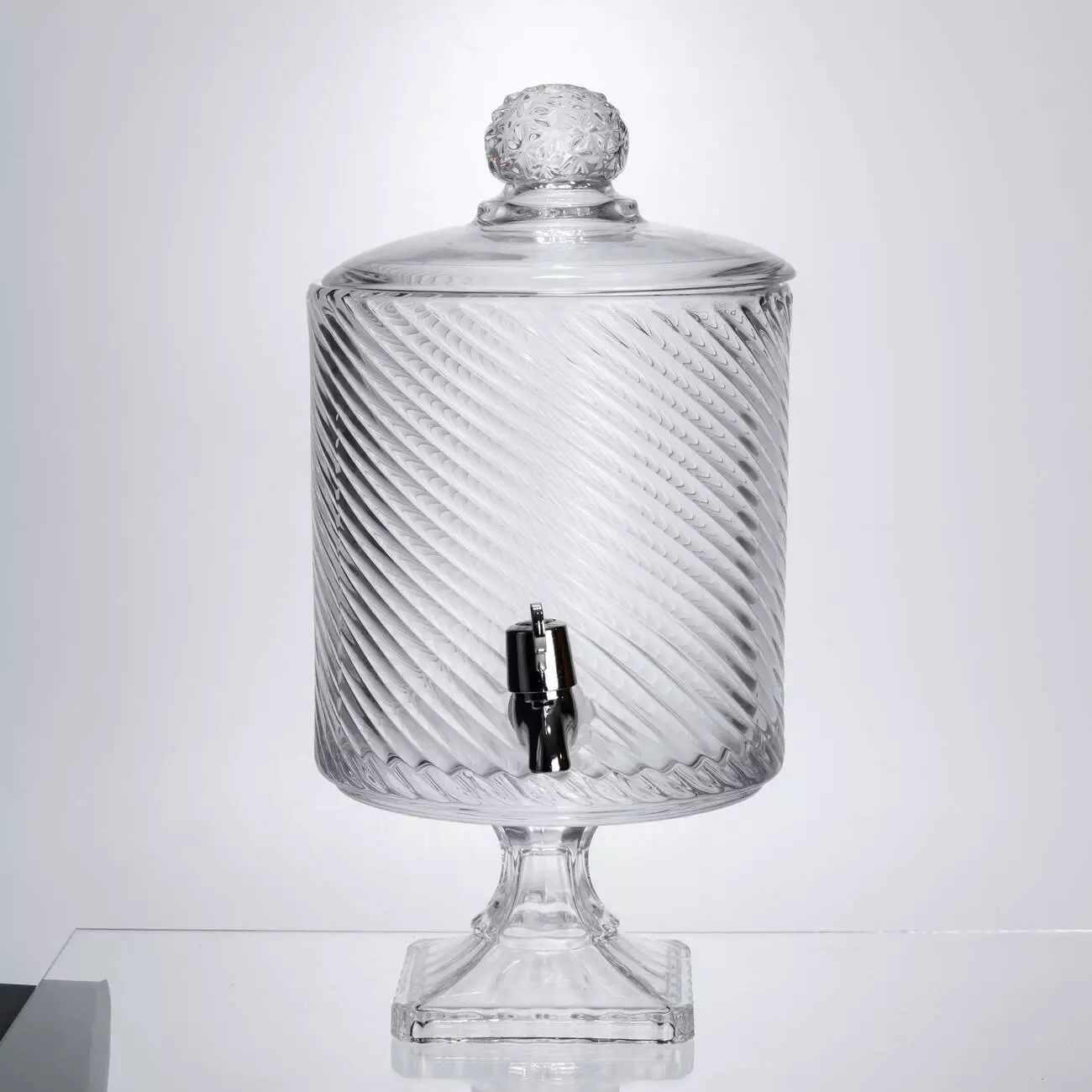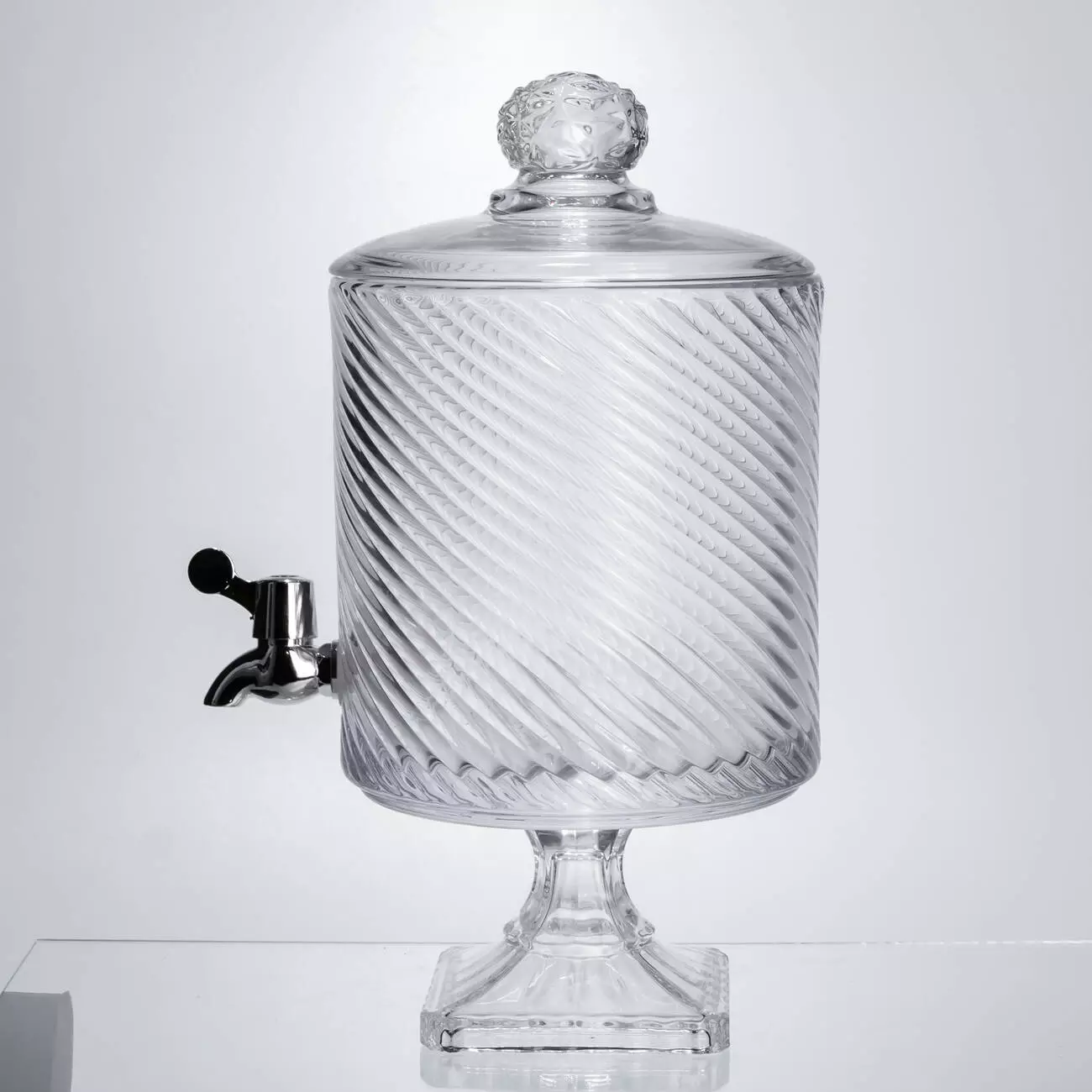 Лимонадниця на ніжці з краном стане зручним рішенням для подачі напоїв у побуті чи під час святкових заходів. Вона виготовлена з товстого скла, що забезпечує міцність та стійкість до навантажень. Завдяки прозорій поверхні завжди видно рівень напою та його колір.