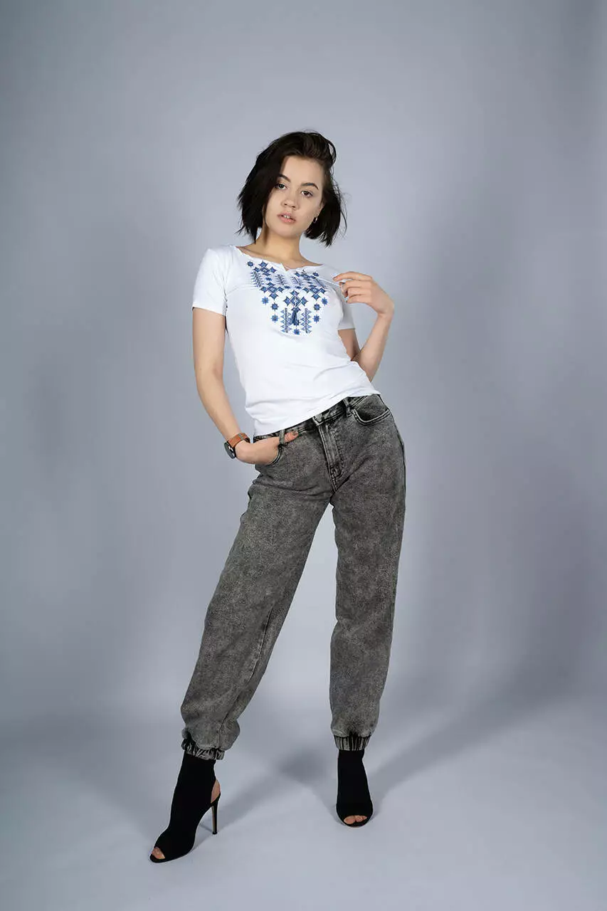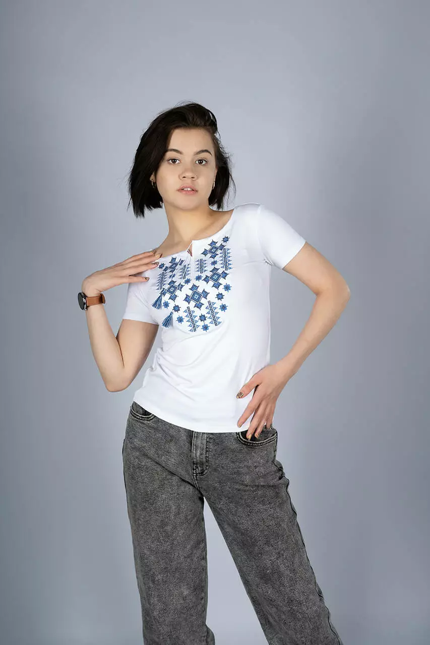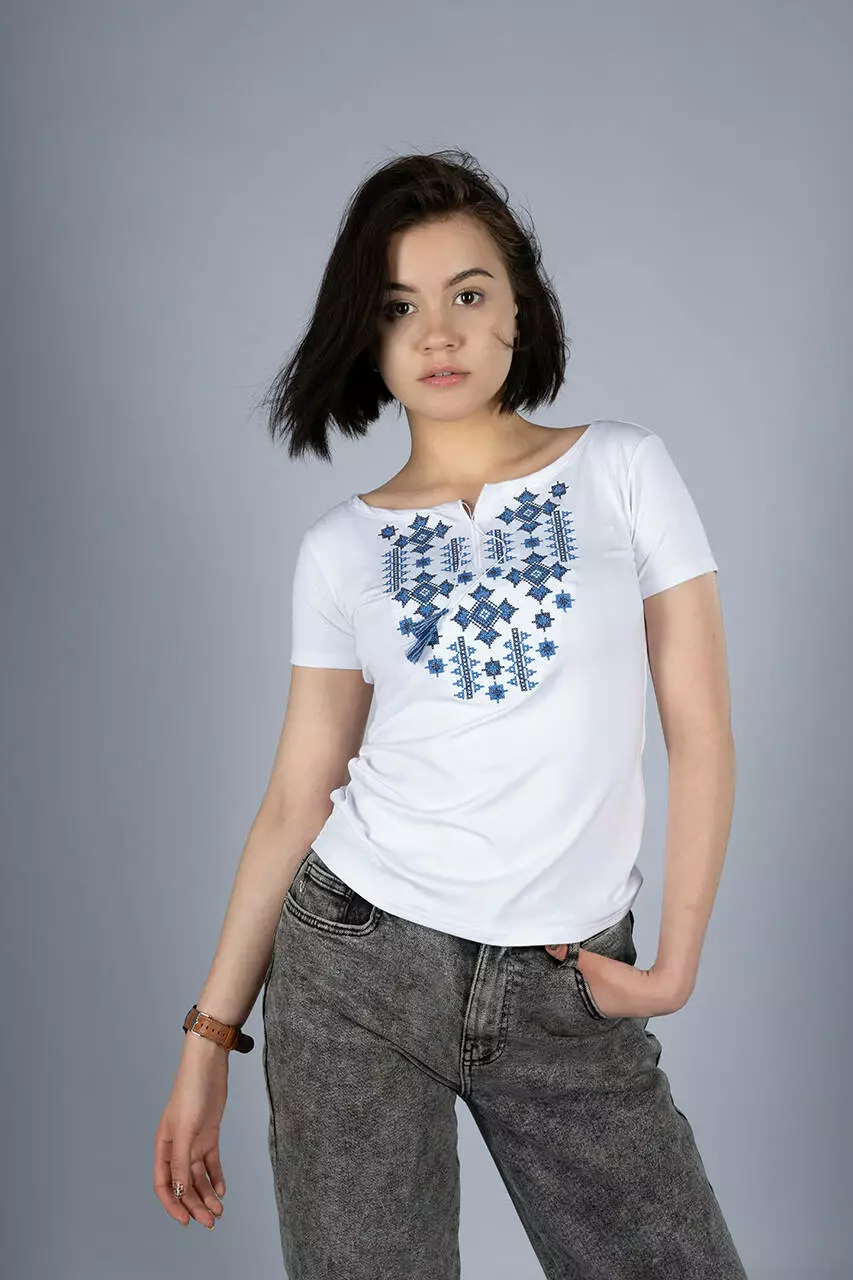 Стильна літня жіноча футболка із вишитими геометричними зірками чудово доповнить гардероб будь-якої справжньої української панянки. Ніжний білий колір підкреслить вашу жіночність та неповторність. Вишита жіноча футболка виготовлена із натуральних матеріалів, які зберігають свій первозданний вигляд довгий час. Футболка чудово підійде для носіння у спеку, та як виготовлена із матеріалів які дихають. Ось вам порада для створення патріотичного образу рвані світлі джинси із вишитою футболкою та чорним рюкзаком.