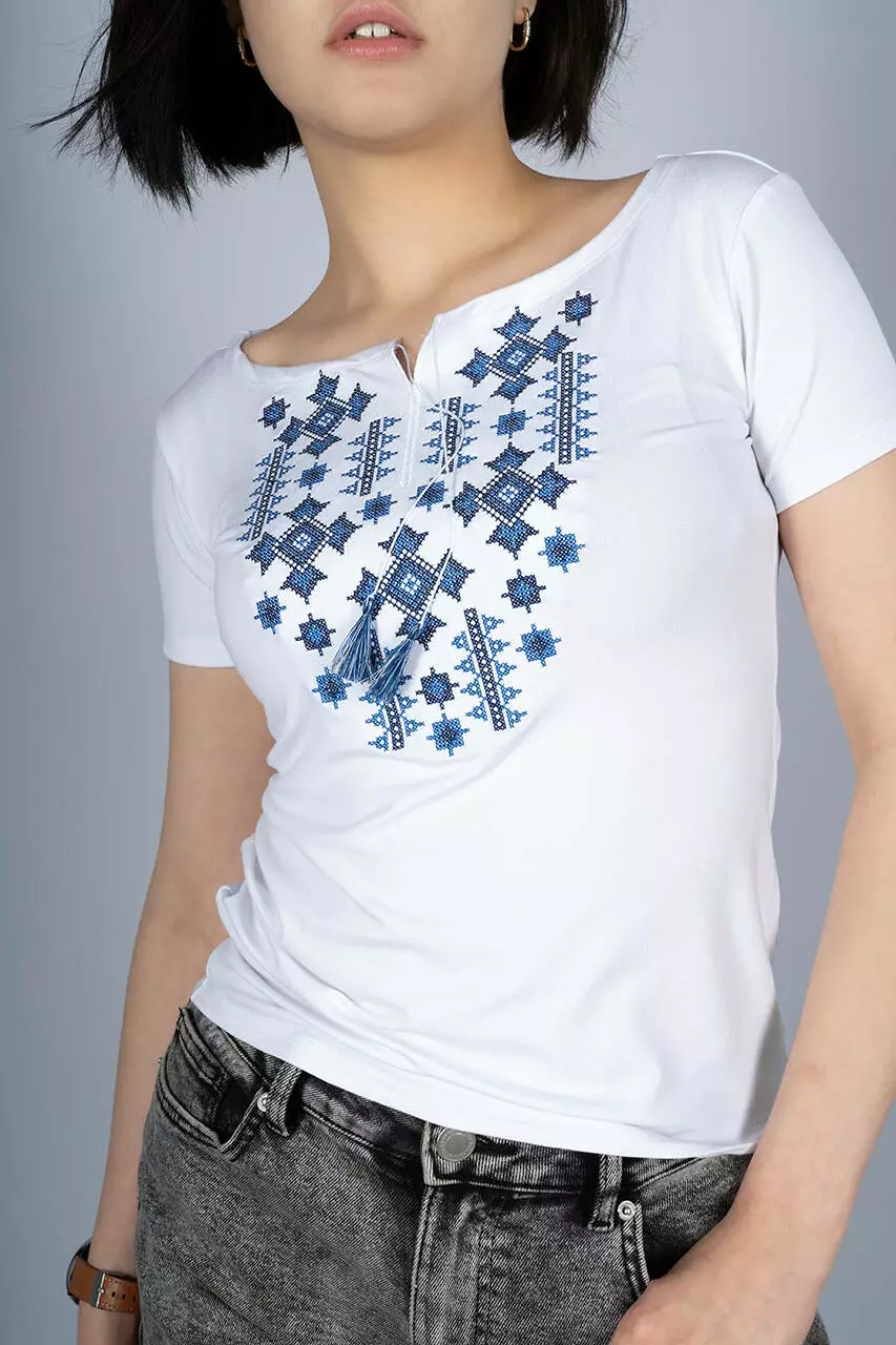 Літня жіноча вишита футболка білого кольору «Зоряне сяйво (синя вишивка)»