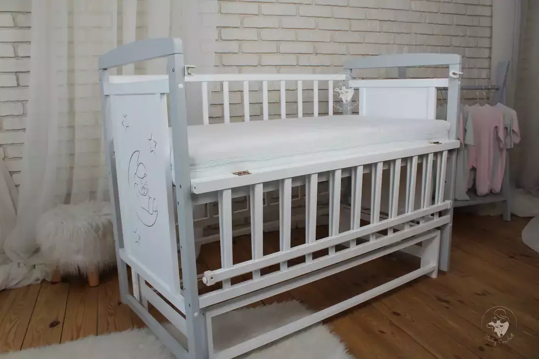 Дитяче ліжечко Baby Comfort TEDDY - уособлення стилю та функціональності. Ліжечко виконане із масиву натурального дерева бук згідно всім вимогам виготовлення меблів для дітей. Вона ідеально відшліфована, пофарбована фарбою на водній основі європейського виробництва - безпечною для малюка та батьків. Бокові стінки прикрашені різьбленням та срібною патиною, що надає ліжечку ексклюзивності. Окрім привабливого зовнішнього вигляду ліжечко володіє широким функціоналом, який значно спрощує батькам догляд за новонародженою дитиною. Це і відкидкий бортик, дякувати якому малюка буде легко дістати з ліжечка, а також - використовувати його як приставне. Безшумний маятник допоможе заколихати дитину, а наявність фіксатора - приємний бонус для діток старше, коли необхідність в заколихуванні відпаде. Днище ліжечка регулюється по висоті, тому в залежності від віку його можна ставити у різне положення.