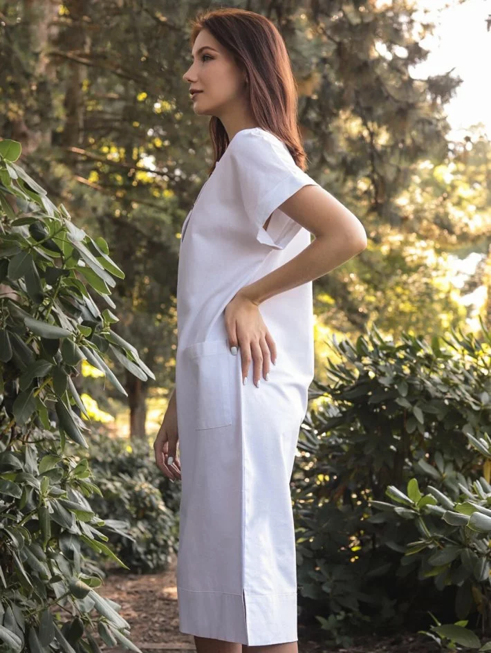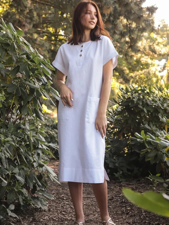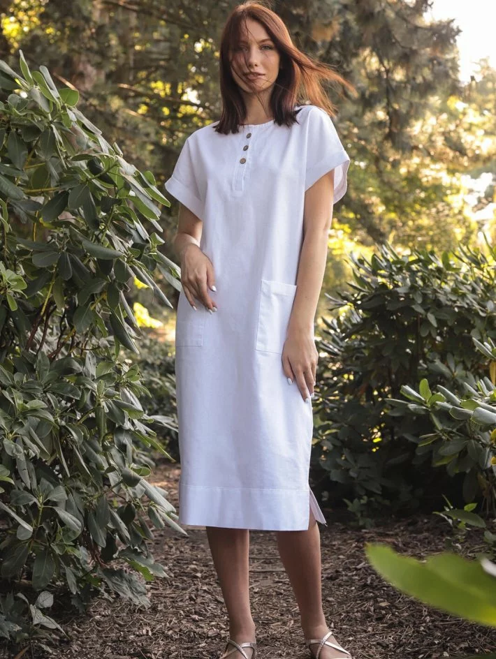 Сукня прямого крою з відкритою горловиною, невелика застібка на