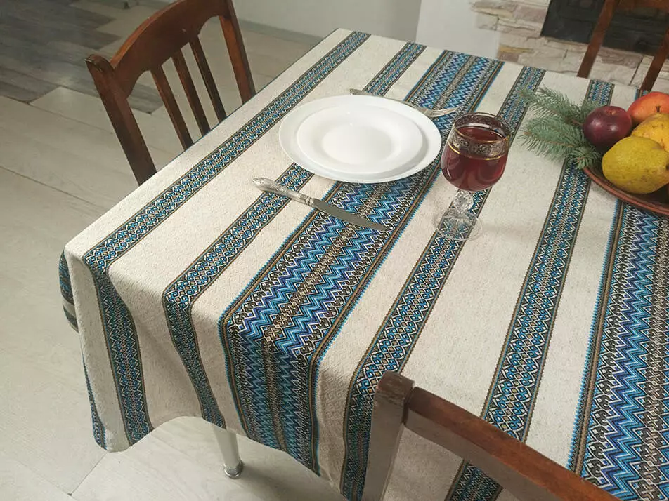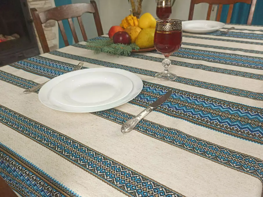 Лляна скатертина з орнаментом Синій, 220х145 см, + 6 серветок