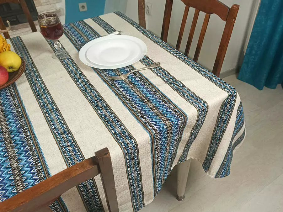 Лляна скатертина з орнаментом Синій, 220х145 см, Без серветок