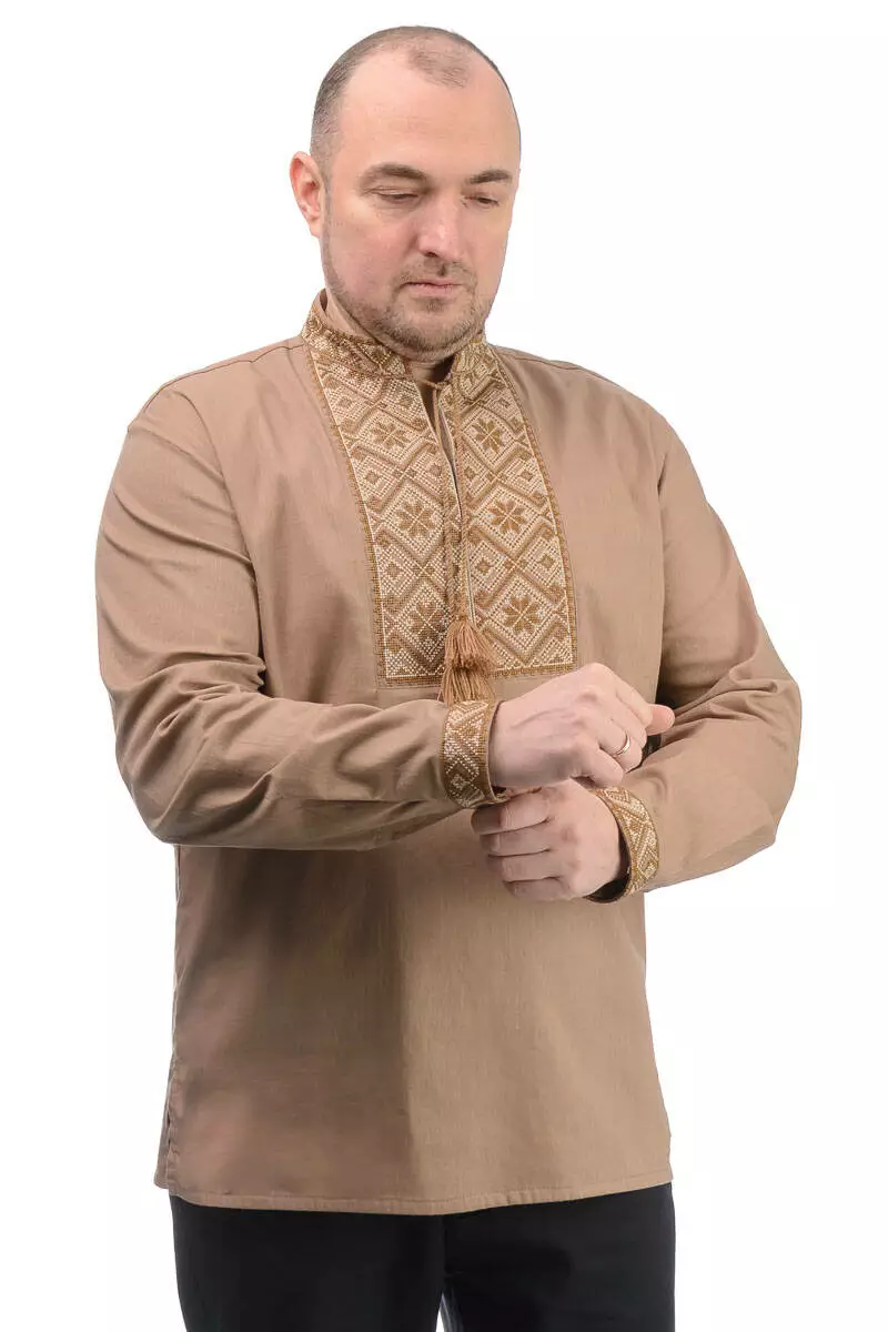 Чоловіча вишиванка в етно стилі - це одяг, що поєднує у собі традиційні елементи української вишивки з сучасними модними тенденціями. Виготовлена з лляного матеріалу і прикрашена машинною вишивкою, імітуючи стиль традиційної української вишивки.