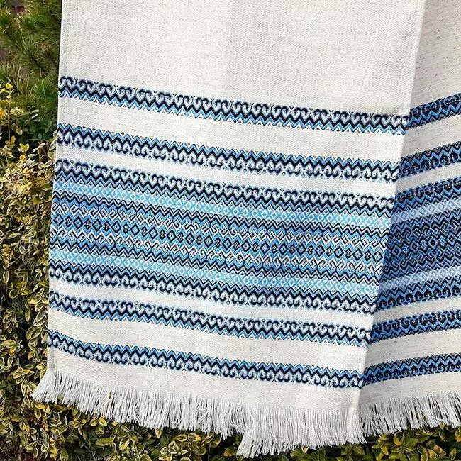Синій весільний рушник під ноги, який часто використовується в українських обрядах.