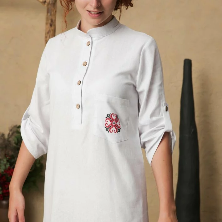 горловині комір- стійка. На кишені сукні класична Українська