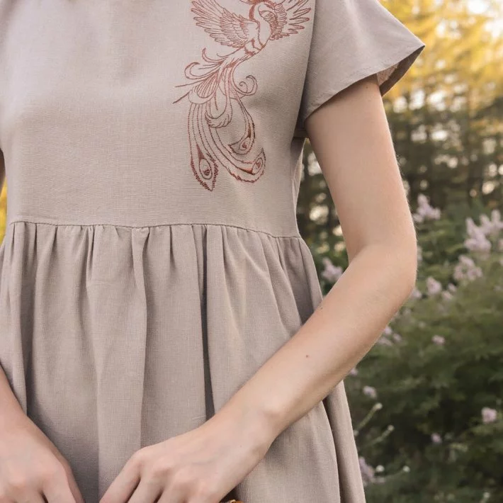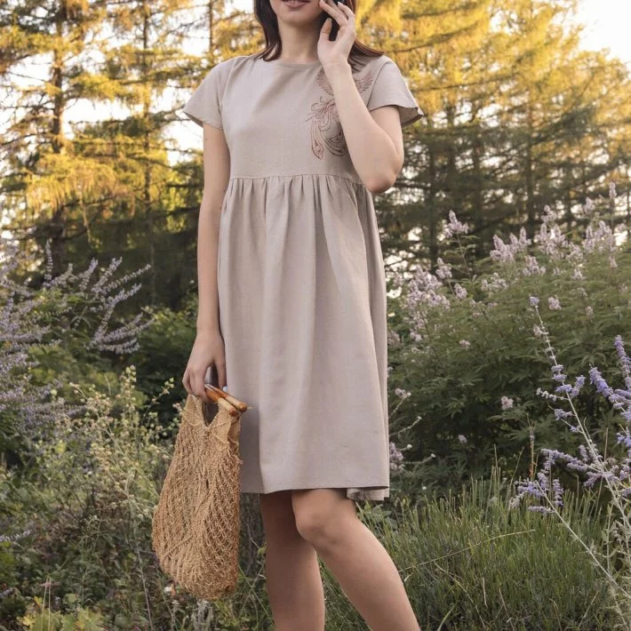 Сукня з натурального льону вільного крою із збіркою по талії. На