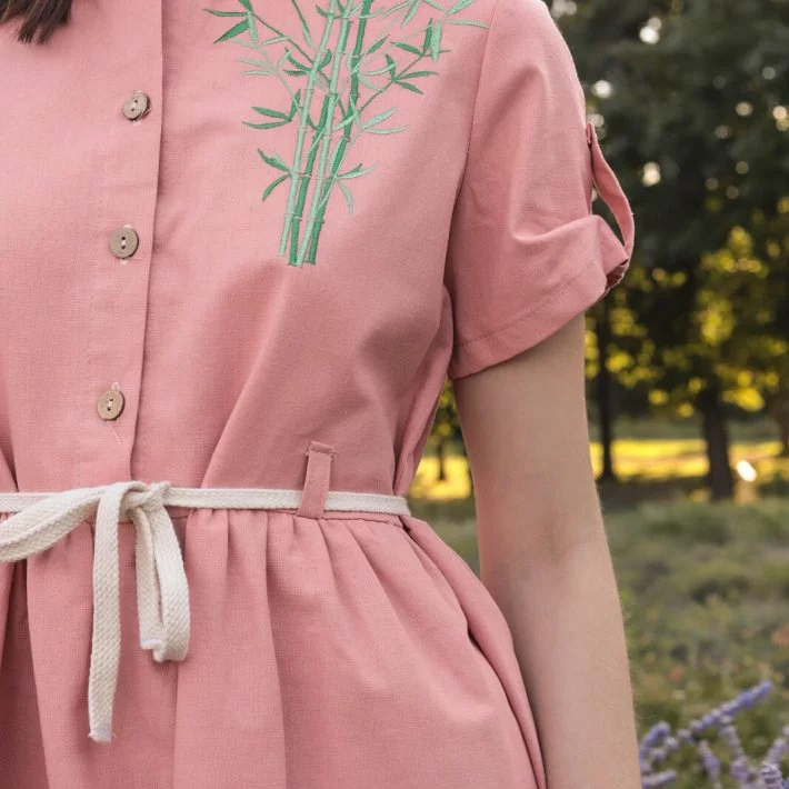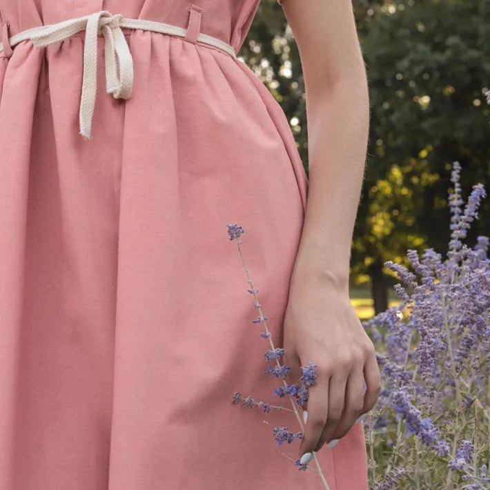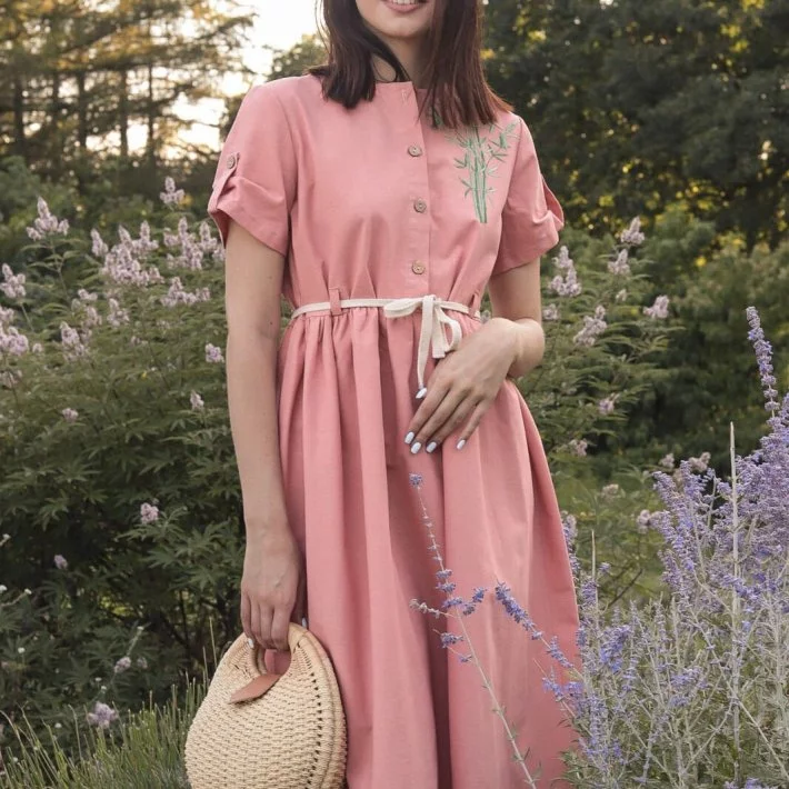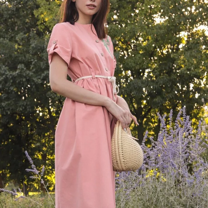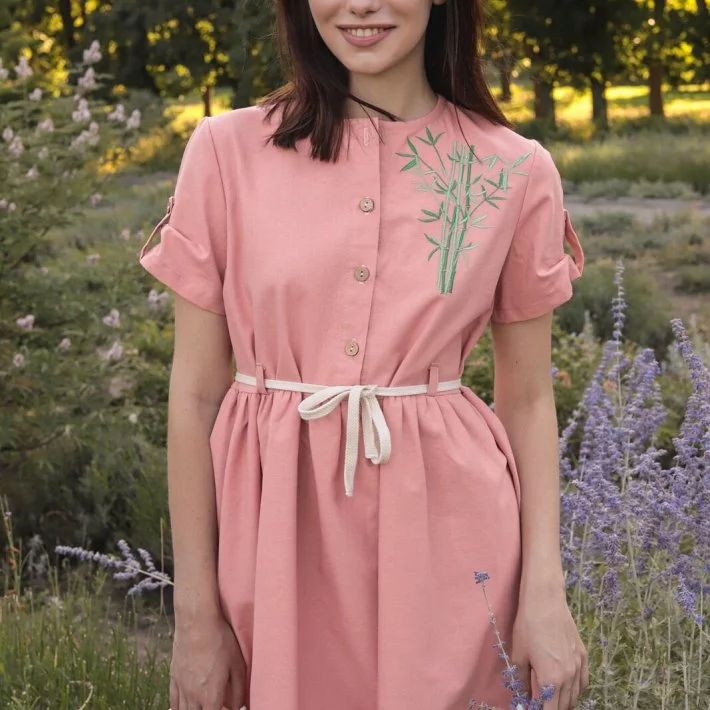 Сукня виконана з натурального льону. Має застібку на гудзиках