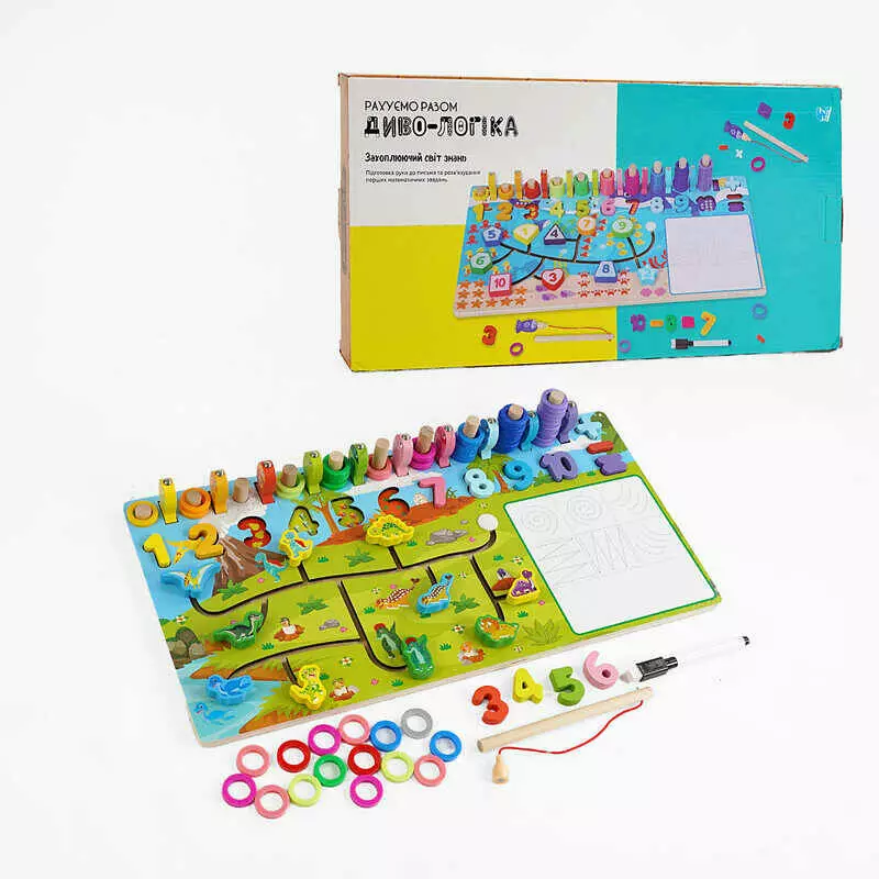 Логічна дерев’яна дошка “Диво-логіка” 47699 №3 "Динозаври"(24) "WToys" магнітна риболовля,пальчиковий лабіринт, дошка для малювання, в коробці