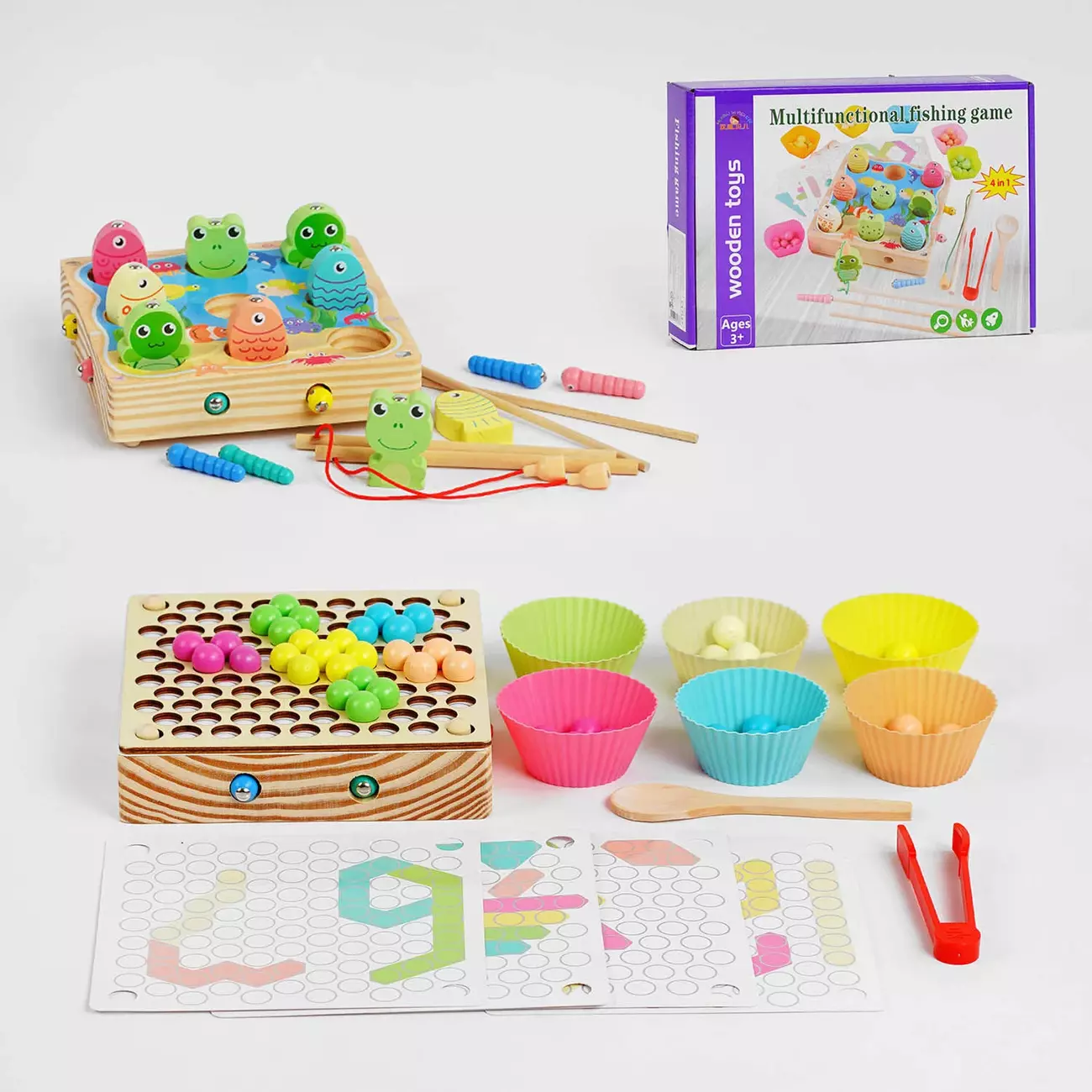 Дерев’яна логічна дошка — чудовий комплекс для раннього розвитку дітей. Вона містить 4 гри, кожна з яких відповідає за свій напрямок розвитку: магнітна рибалка, черв’ячки, логічна гра та мозаїка. Як грати? 1. Магнітна рибалка Вудка з магнітним наконечником чудово ловить мешканців ставку: рибок, жаб та черепашок. Під час гри малюк розвиває координацію рухів. 2. Черв’ячки З боків ігрової панелі сховалися кольорові черв’ячки. Завдання: треба дістати їх з отворів за допомогою вудки або паличок. 3. Мозаїка В наборі є 5 двосторонніх карток з різними малюнками. Оберіть один та покладіть його на платформу під дерев’яну основу з отворами. Завдання: заповнити отвори кульками відповідного кольору за допомогою щипців. 4. Логічна гра Розкладіть по одній кульці на шахівницю таким чином, щоб кульки одного кольору не знаходились поруч. Для цього можна залучити пінцет, ложечку або палички. Особливості: - виконана із якісної деревини та не містить шкідливих фарбників; - 4в1: магнітна рибалка, черв’ячки, мозаїка, логічна гра; - включає 5 двосторонніх ігрових карток; - сприяє розвитку посидючості, уважності, логічного мислення. Комплектація: - ігрова панель; - 9 мешканців ставка; - 8 черв'ячків; - кольорові кульки; - 2 вудки; - 2 палички; - щипці; - ложка; - 5 ігрових карток; - 6 кольорових кошиків; - мішечки для зберігання дрібних елементів; - інструкція.