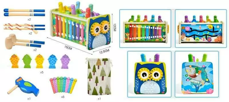 Ігровий центр C 75625 (12) дерев’яний, 5 ігрових панелей, стукалка, ксилофон, лабіринт, рухомі шестерні, циферблат, 2 молоточки, 2 палички, у коробці