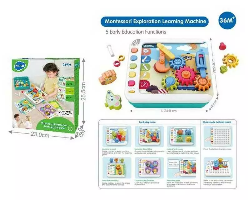 Логічна гра HE 898700 (12) "Hola", озвучування англ. мовою, шестерні, фігурки тварин, геометричні фігури, кольори, картки, в коробці