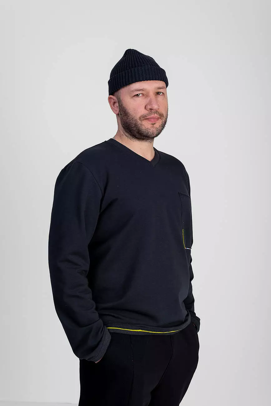 Лонгслів чоловічий з кишенею, колір графіт, оздоблення салатовий