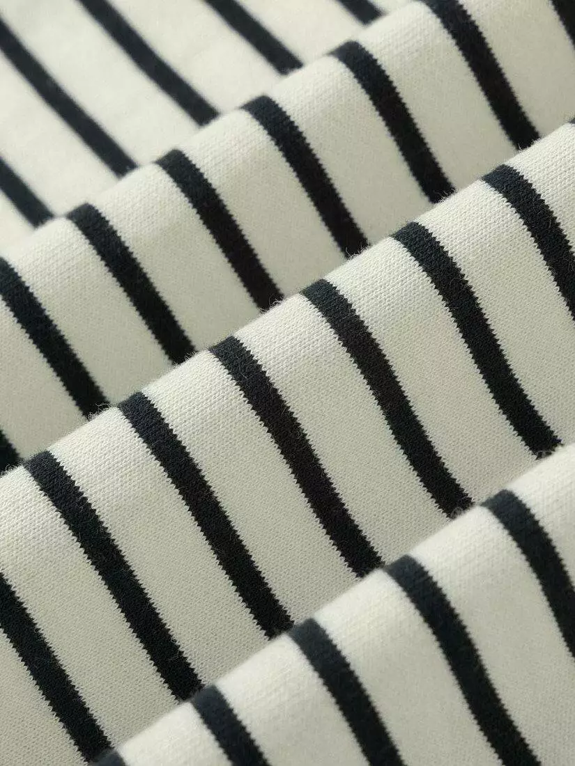 білого кольору у тонку чорну смужку. Кругла горловина декорована