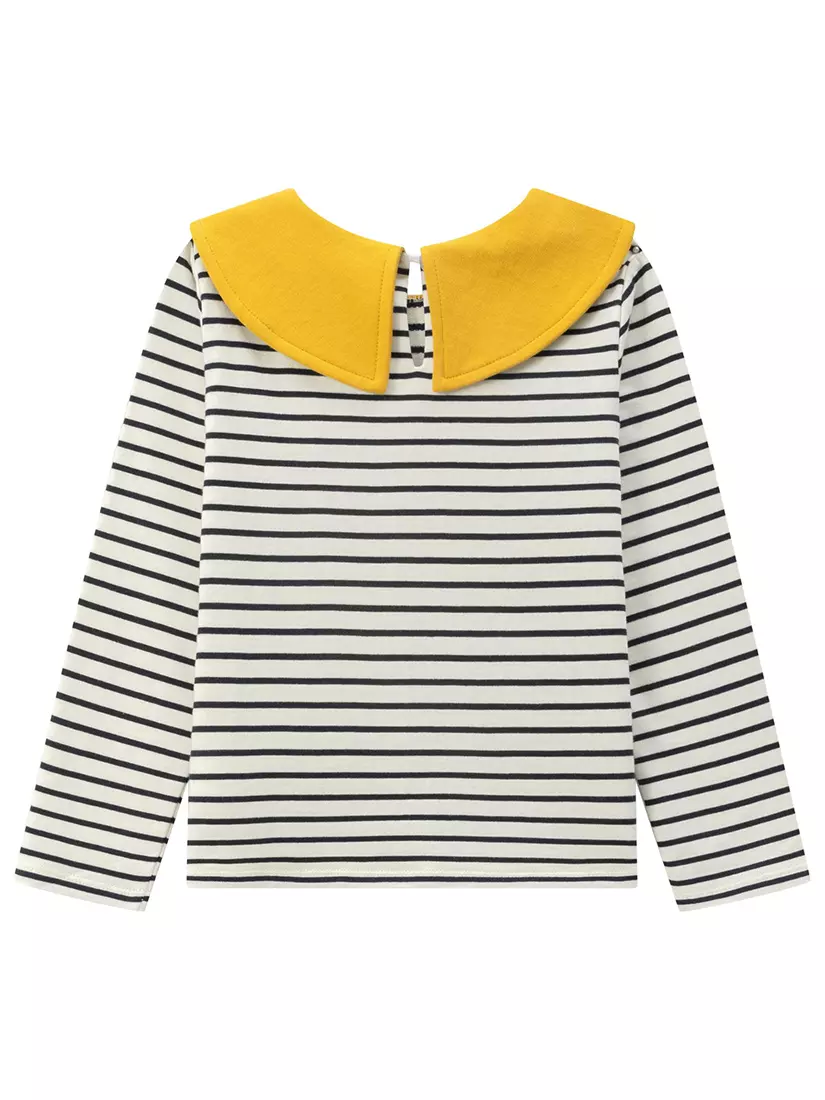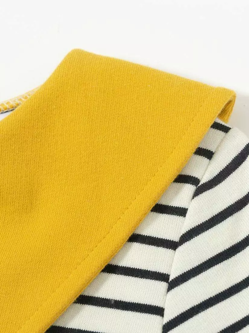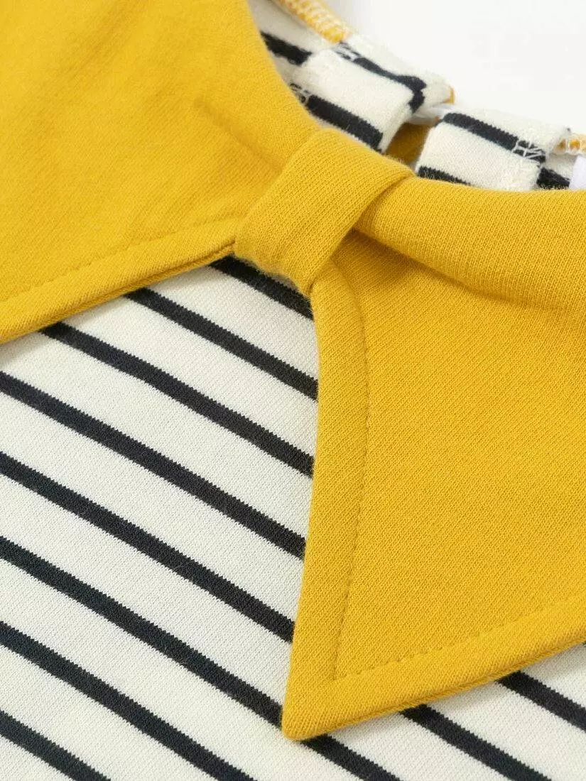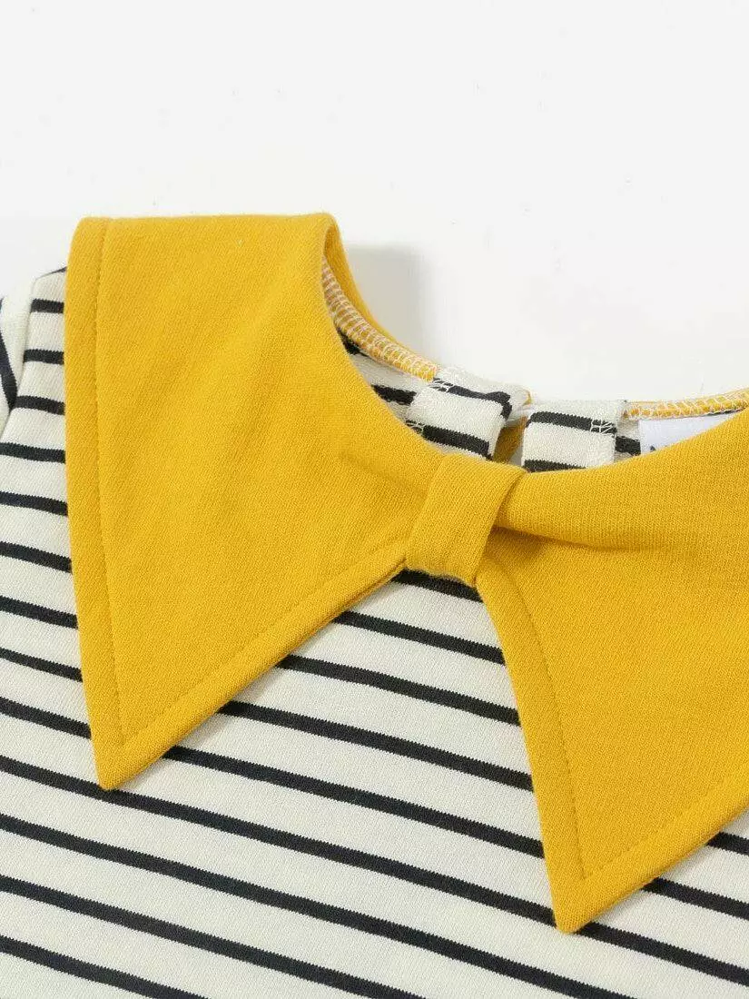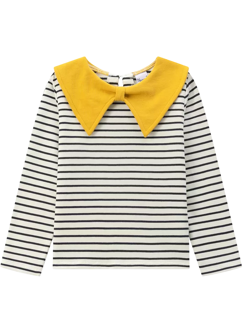 Зустрічайте нову колекцію - колаборація брендів YUMSTER і NEWNESS! Цей лонгслів дуже гарний, щоб просто пройти повз. Чіпляє погляд своїм незвичайним дизайном коміра. Деталі моделі: світшот білого кольору у тонку чорну смужку. Кругла горловина декорована яскравим помаранчевим коміром у вигляді банта. Позаду застібка на ґудзичок. Довгий рукав. Прямий крій. Натуральна тканина! Розмірний ряд: на зріст від 98 см до 140 см