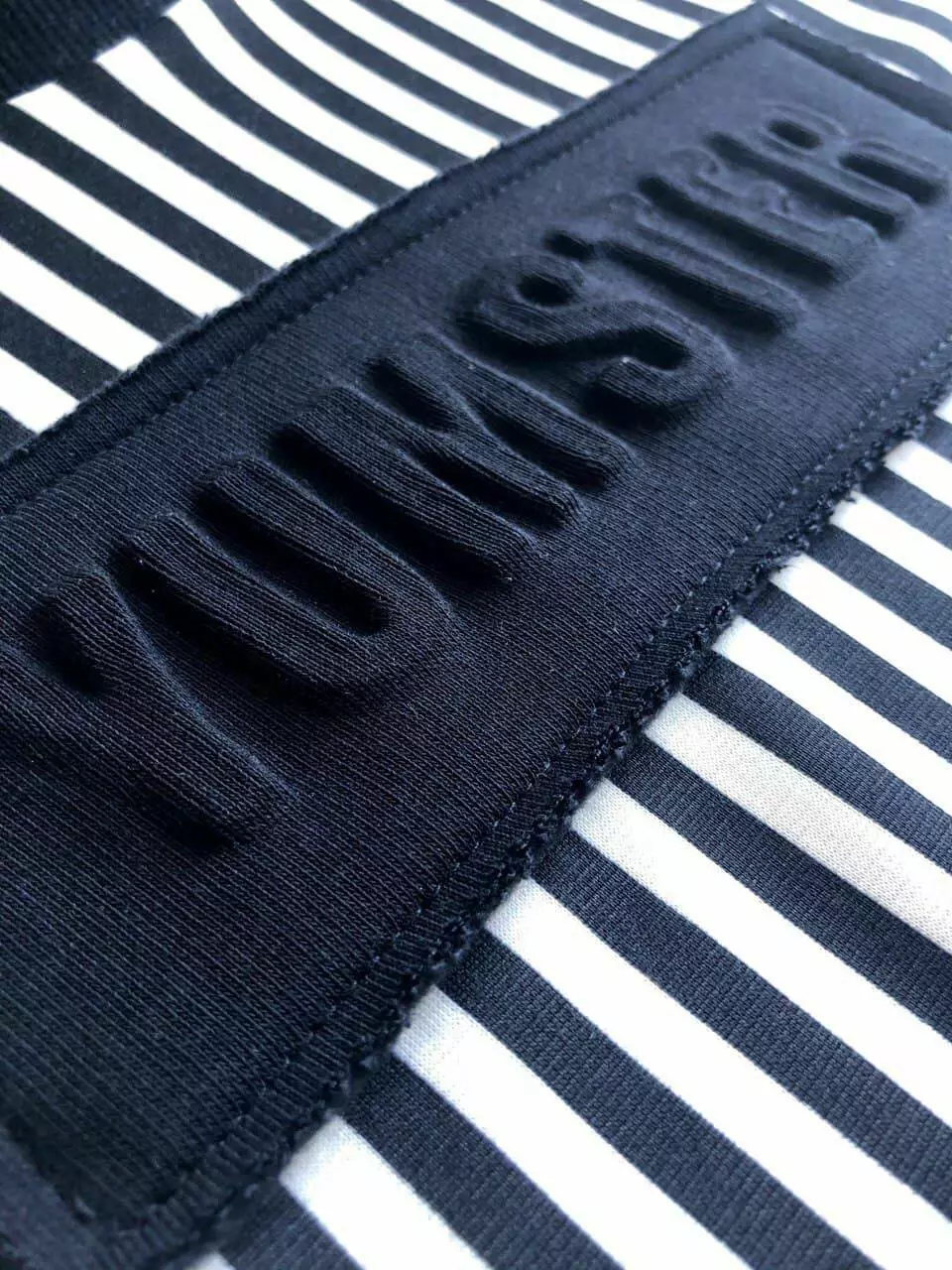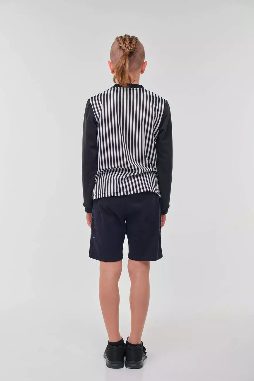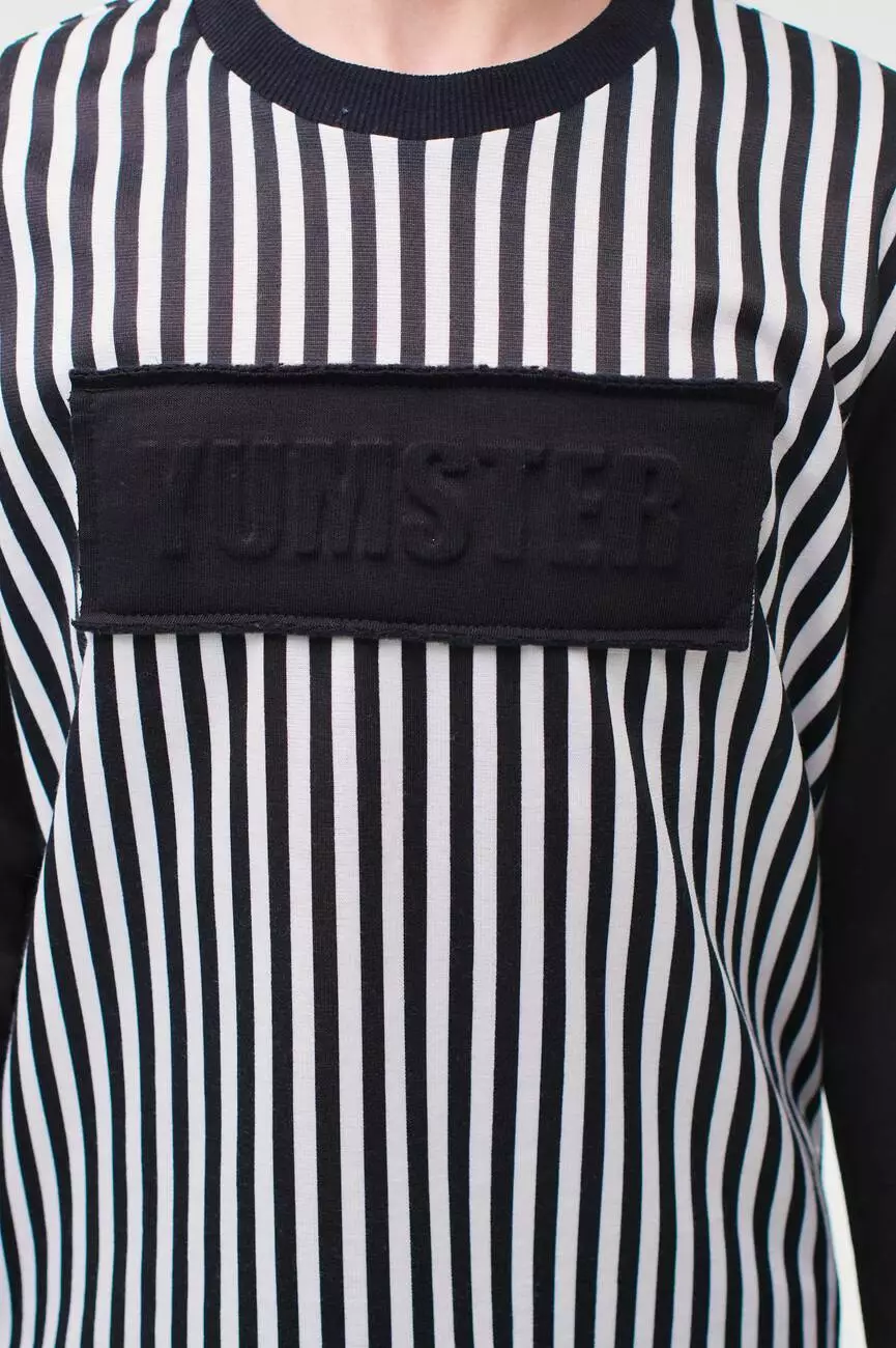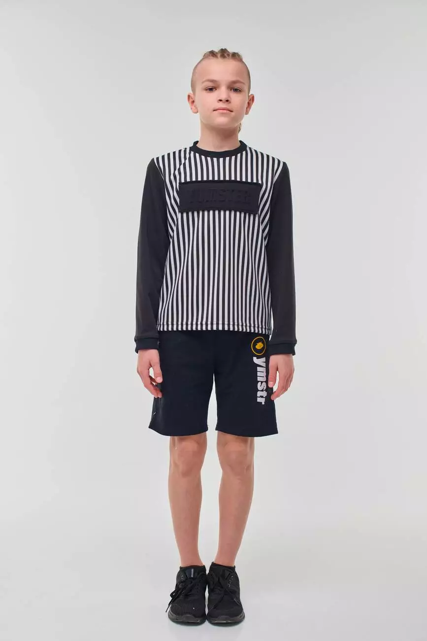 Деталі моделі: лонгслів в чорно-білу смужку. Кругла горловина. Рукава - однотонні, чорного кольору. Манжети на рукавах виконані з якісної рибани. На грудях аплікація з 3D тисненням.
