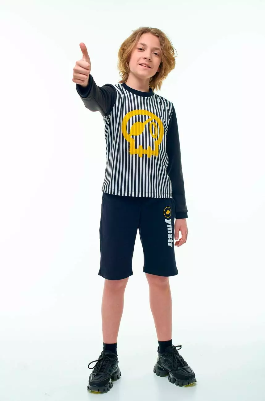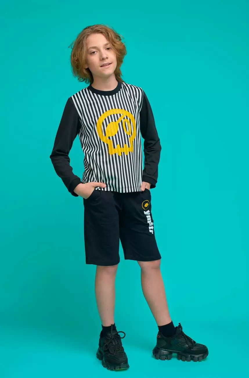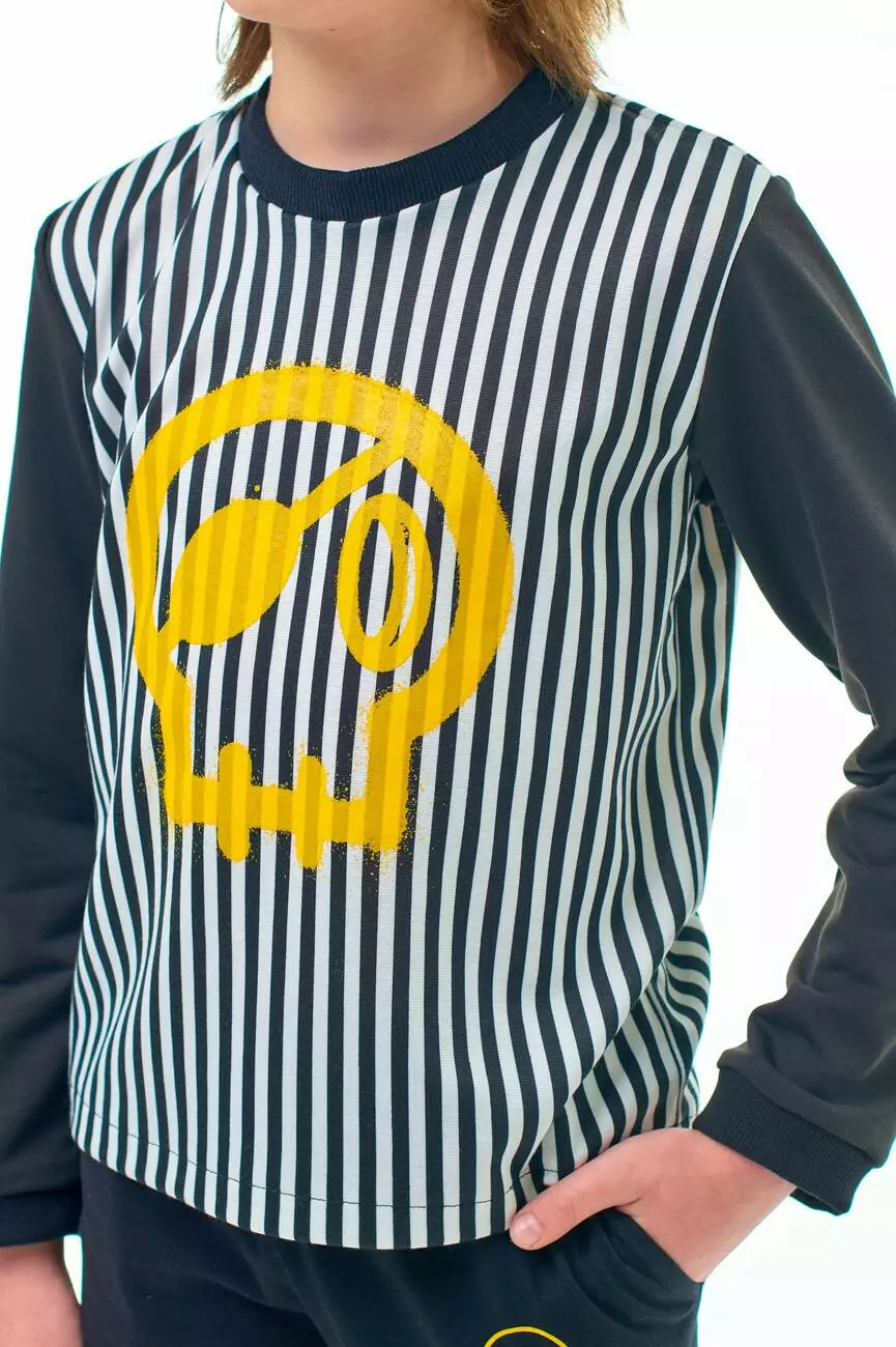 Деталі моделі: лонгслів в чорно-білу смужку. Кругла горловина. Рукава - однотонні, чорного кольору. Манжети на горловині та рукавах виконані з якісної рибани. На грудях жовтий принт - череп.Склад: 70% бавовна, 30% поліестерРекомендації по догляду: машинне прання при температурі 30 градусів. *Відтінок кольору на фотографії може відрізнятися від реального]]>