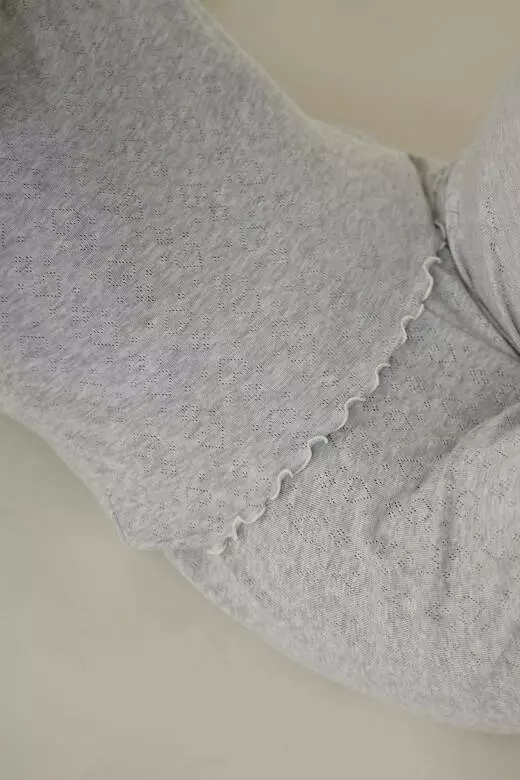 Жіночий лонгслів з довгим рукавом з ажурного трикотажу з принтом у вигляді сердець - це чудовий вибір для створення стильного образу. Сірий меланж надає їй ніжності та елегантності. Зверніть увагу що цю кофту Ви можете доповнити шортами, штанами, футболкою, майкою з цієї тканини. І ви матимете багатофункціональний домашній образ зі 100% бавовни.