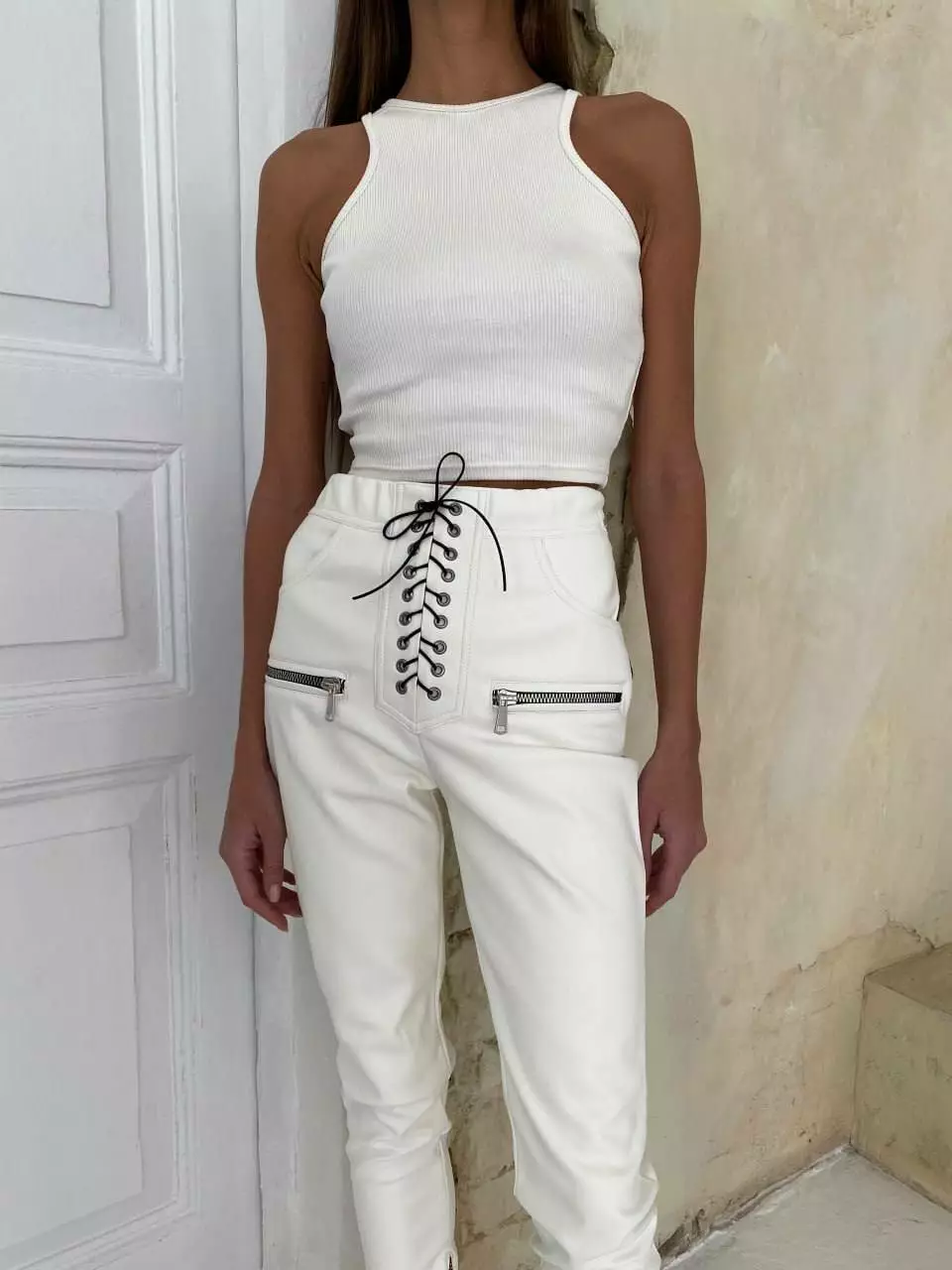 Лосини NIKKY LUX з екошкіри на замшевій основі - практичні, еластичні, зручні та завжди додають в образ вишуканості. Модель має комфортну посадку, акцентну шнурівку спереду та змійки з внутрішнього шва та вгорі з боків.
