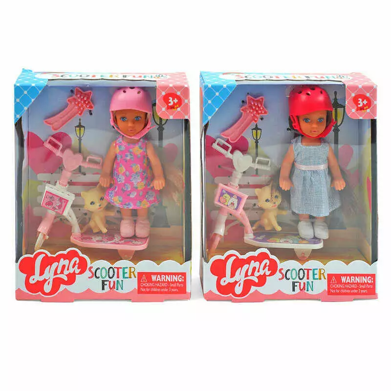 Лялька 4604 (96/2) 2 види, 12 см, знімне взуття, шолом, самокат, гребінець, улюбленець, в коробці