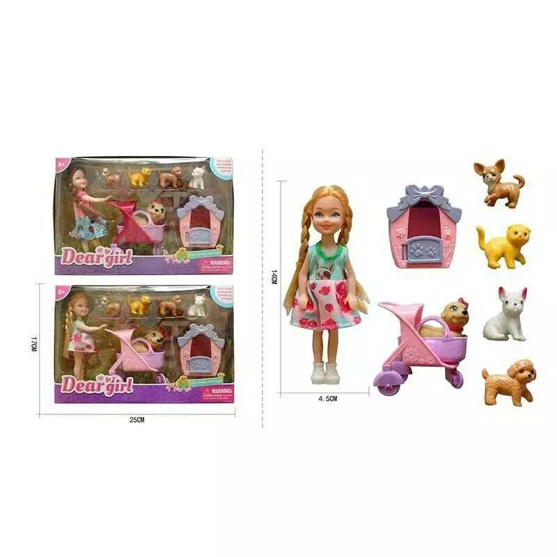 Лялька L 5-21 (96/2) 2 види, висота ляльки - 14 см, гумова голова, 5 фігурок тварин, лялька, будка, візочок, рухомі деталі, в коробці
