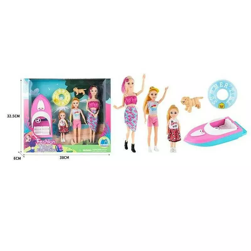 Головна > Каталог > Іграшки > Ляльки > Лялька з аксесуарами ST 5616-8 (36/2) 3 ляльки, висота 30 см, лодка, круг для плавання, собачка, в коробці оптом