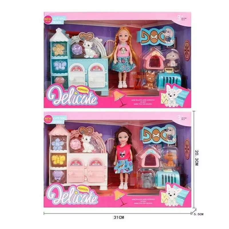 Лялька з меблями 9910 (96/2) 2 види, висота ляльки 14см, рухливі кінцівки, 3 улюбленці, дверця шафи відчиняються, будка, переноска, в коробці