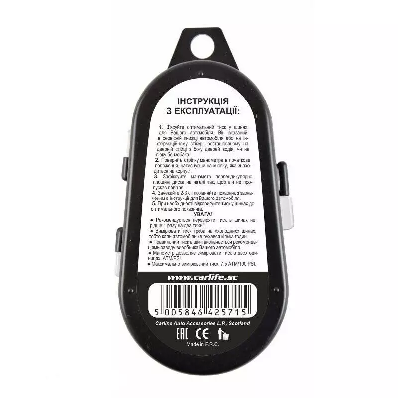 Манометр аналоговый CarLife для легкового авто 7.5 Атм с кнопкой сброса в пластиковом футляре (TG571/P)