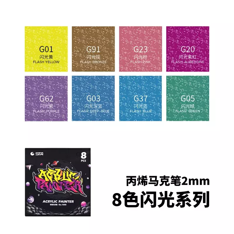 Маркеры акриловые STA для рисования, премиум качество, набор 8 Glitter цветов