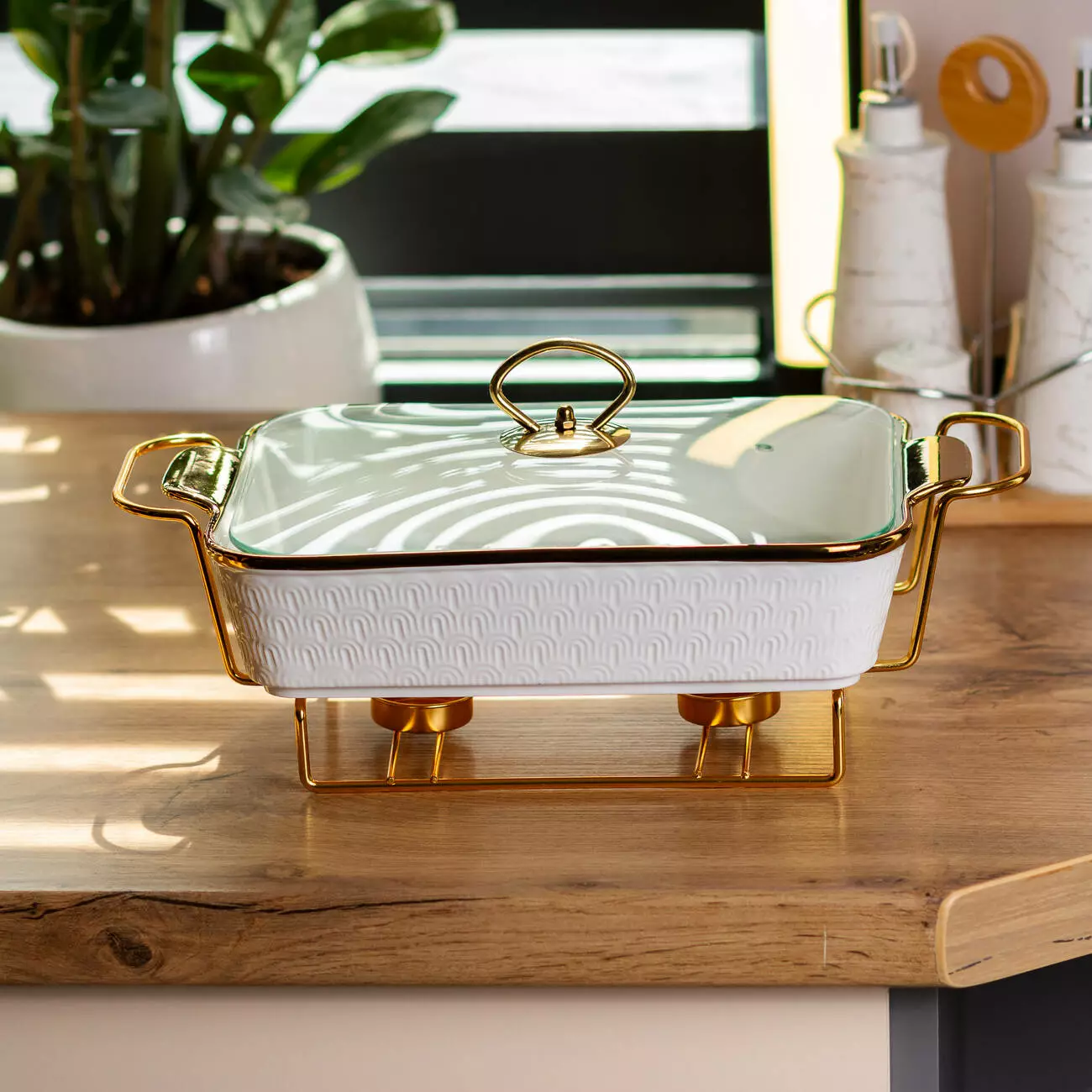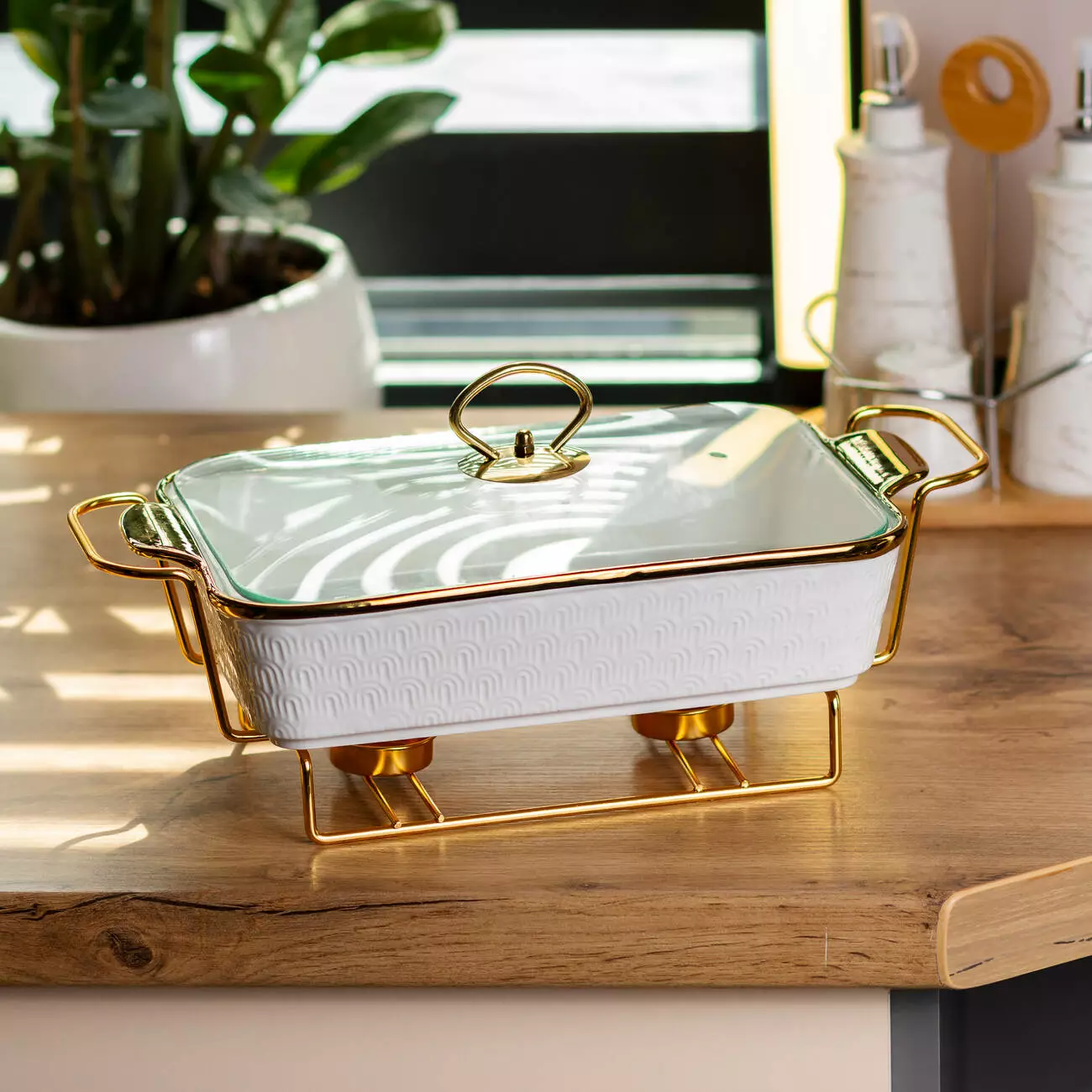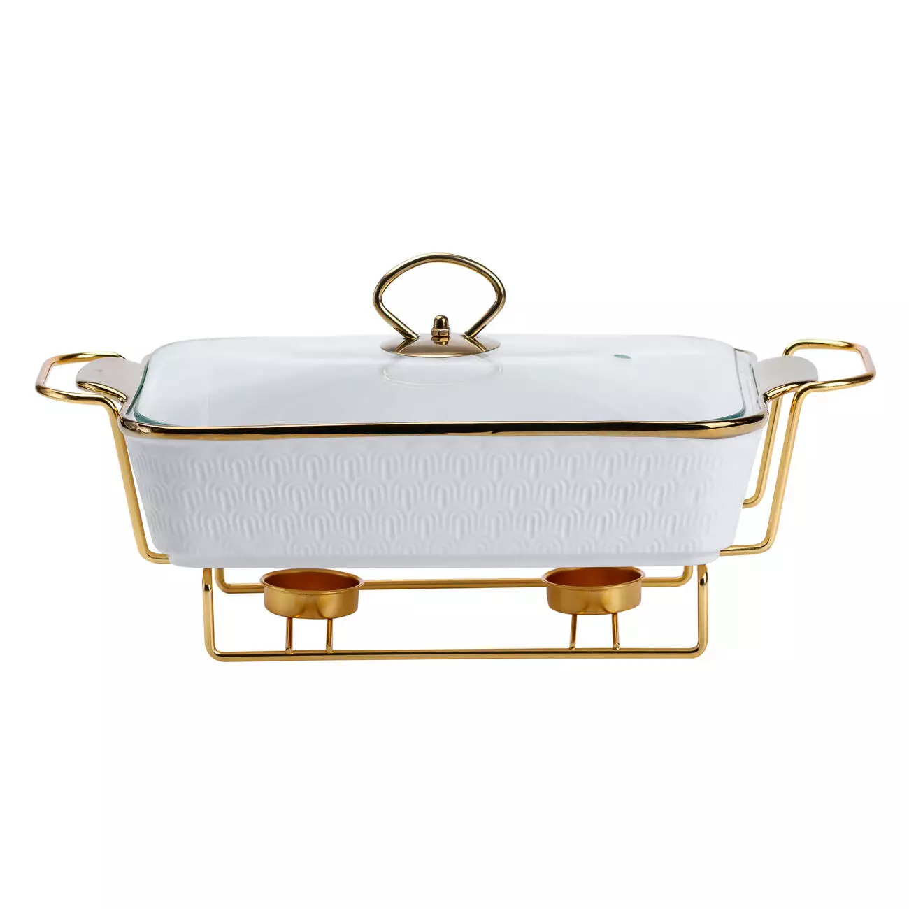 Корпус виготовлений із порцеляни – матеріалу, який добре зберігає тепло і не впливає на смак страв. Металева підставка виконує функцію тримача, що дозволяє розмістити ємність на столі з мінімальним ризиком перекидання. Завдяки універсальному дизайну, виріб доречно виглядає в різних інтер’єрах – від класичної сервіровки до сучасного стилю.