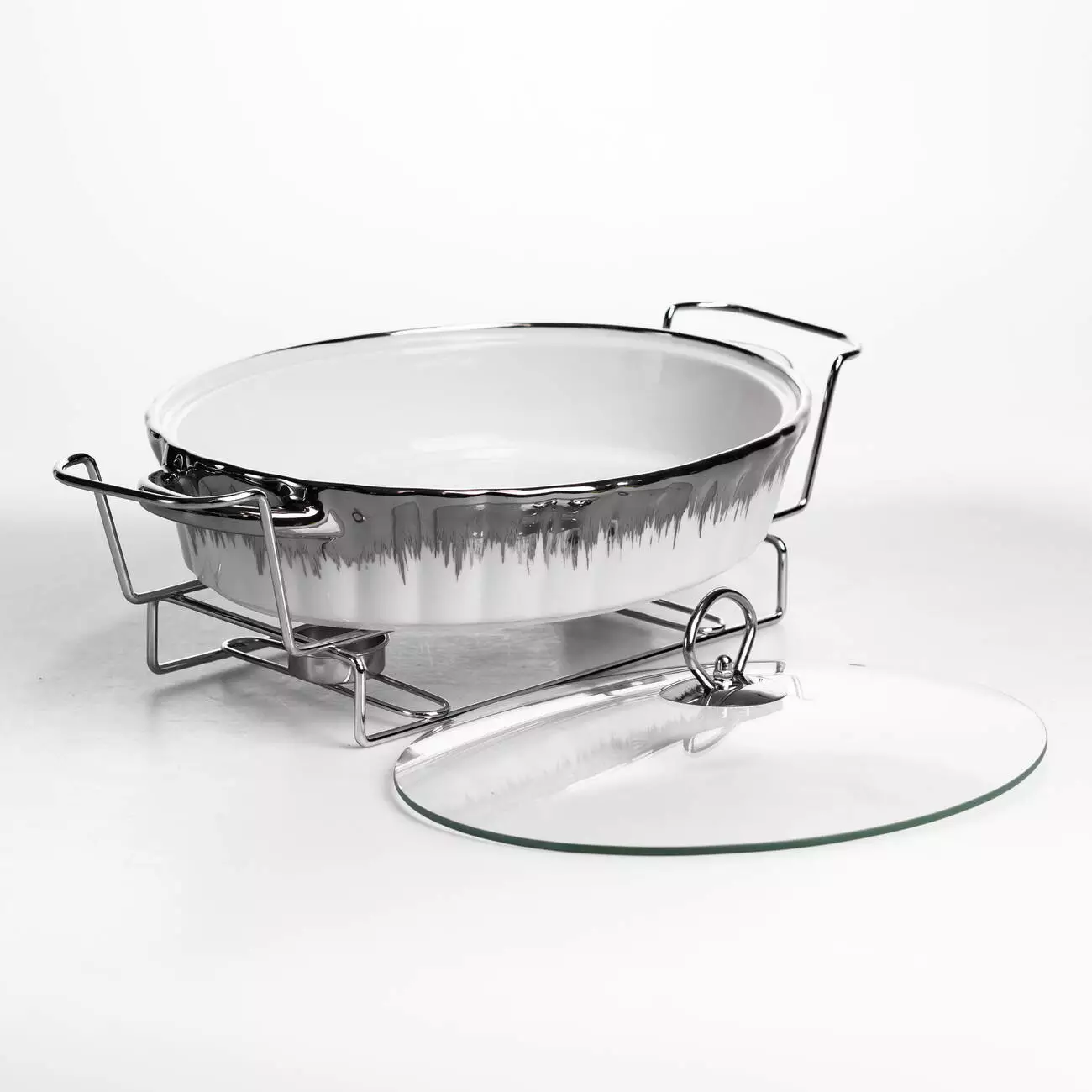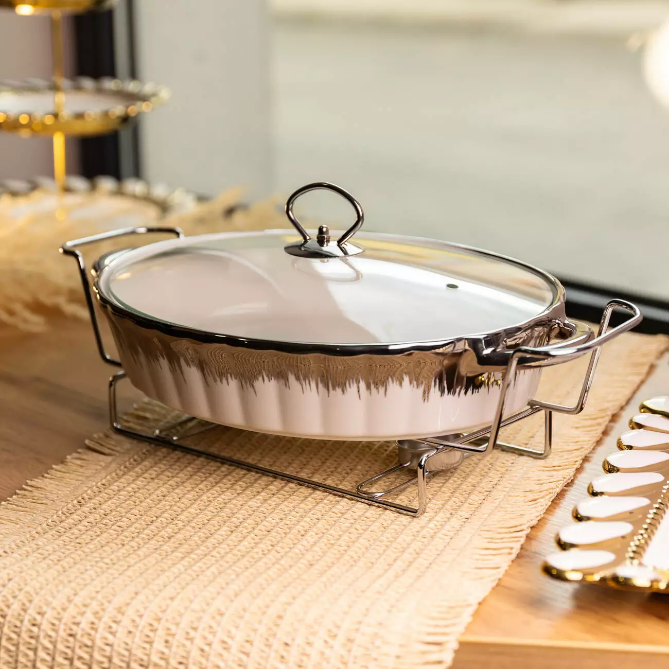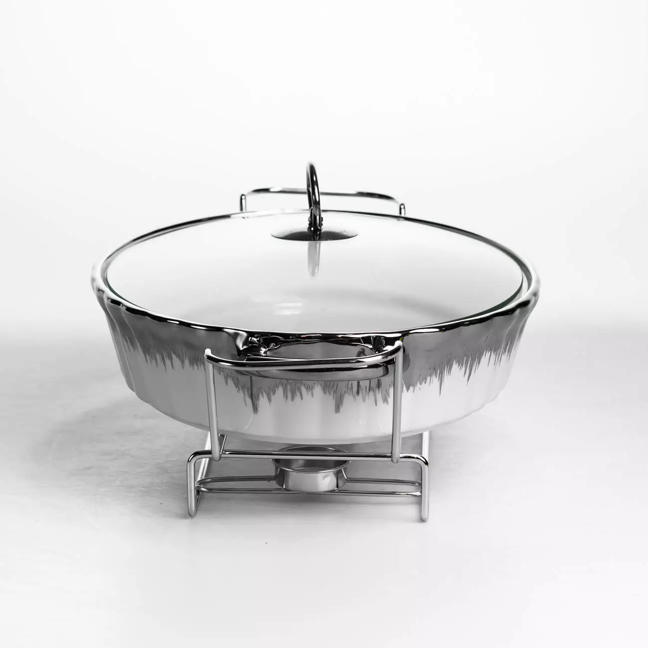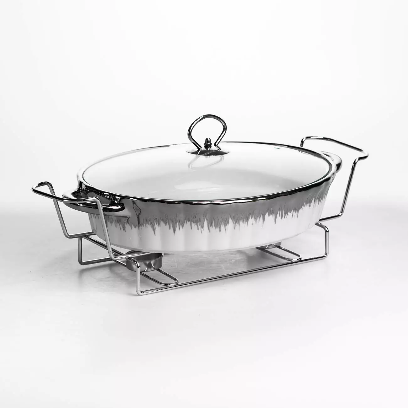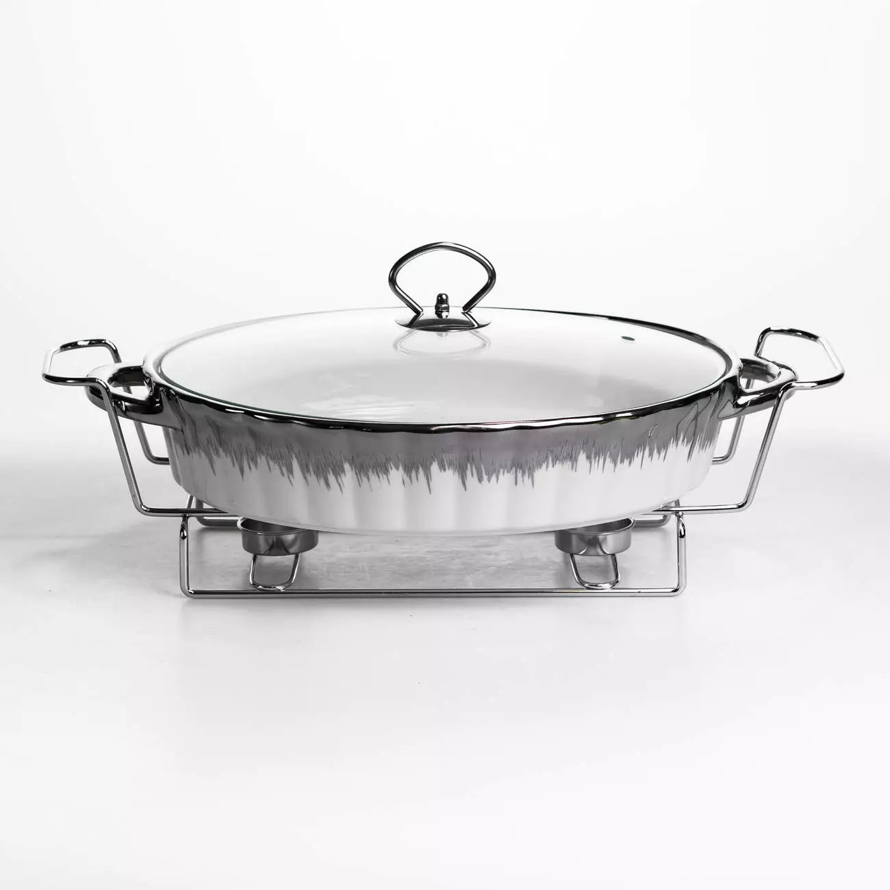 Мармітниця порцелянова овальної форми призначена для подачі гарячих страв із підтриманням температури. Завдяки металевій підставці з підігрівом її можна використовувати без підключення до електрики, що зручно для сервірування вдома або під час заходів. Конструкція забезпечує рівномірне збереження тепла страви протягом подачі.