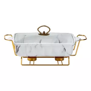 Золотиста металева підставка з підігрівом не тільки підкреслює елегантність мармітниці, але й забезпечує зручність та функціональність. Вона дозволяє підтримувати страви гарячими протягом тривалого часу, що особливо важливо під час довгих обідів чи святкових заходів. Ваша їжа завжди буде теплою та апетитною, що сприятиме приємній атмосфері за столом.