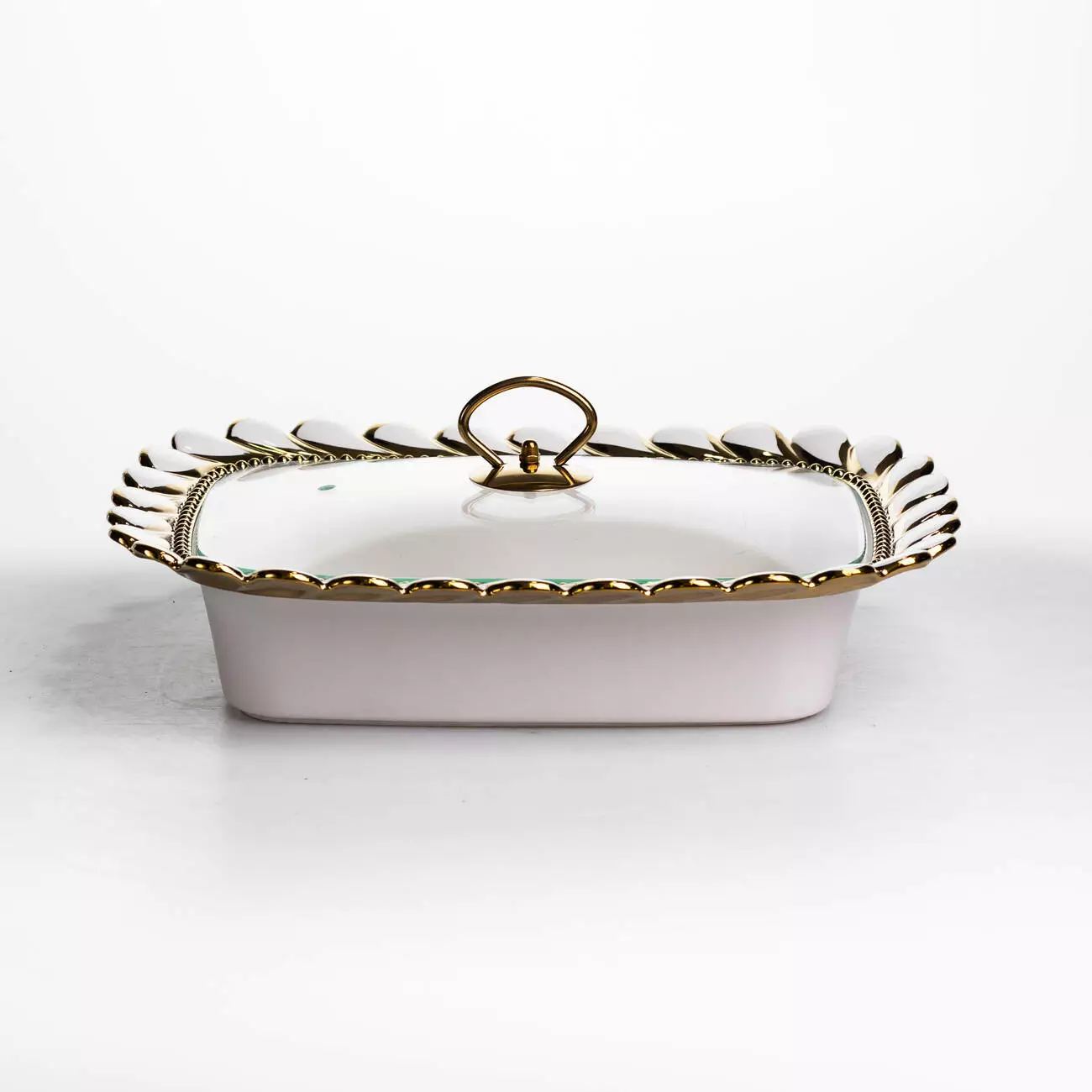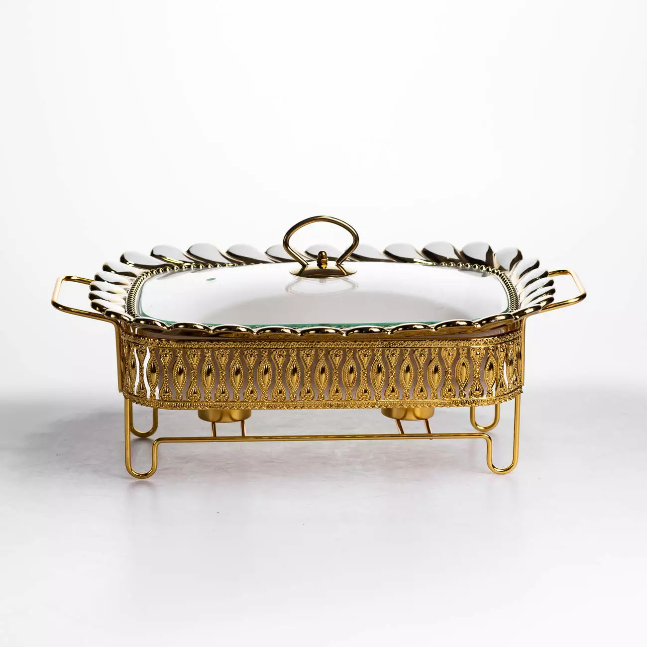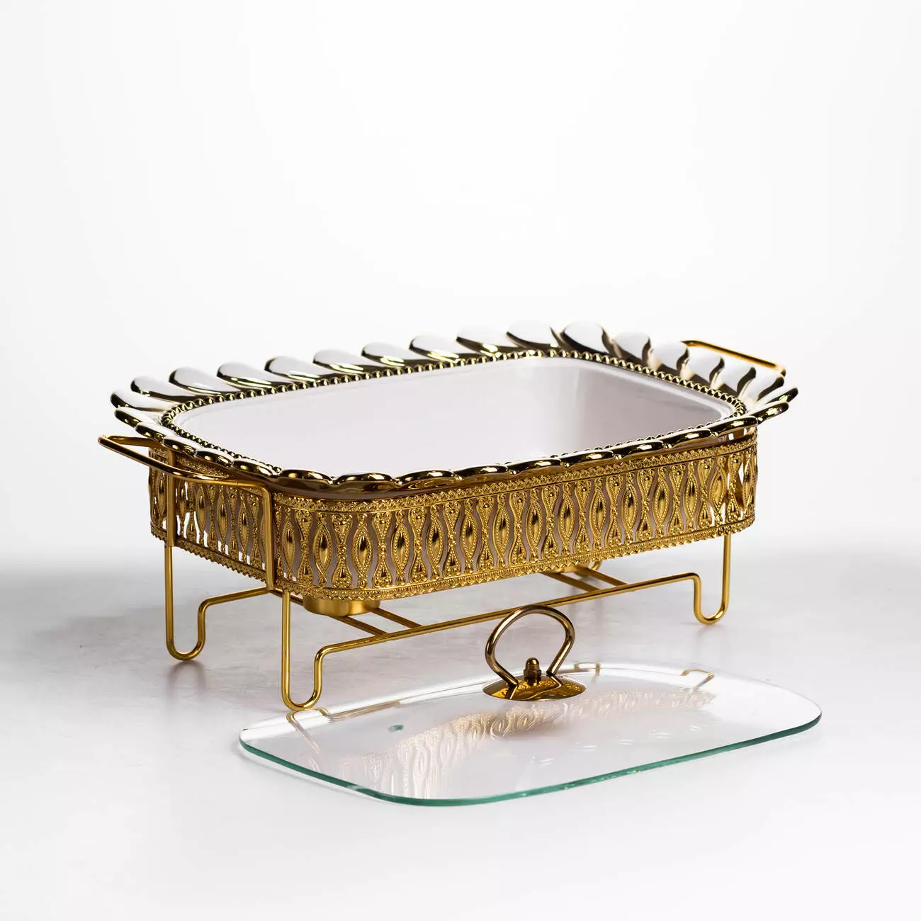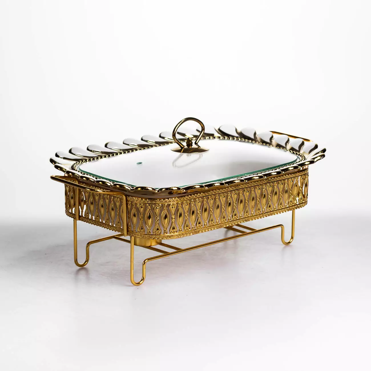 Основна ємність виготовлена з порцеляни, що забезпечує стійкість до температурних змін і простоту в догляді. Скляна кришка дозволяє контролювати вміст без необхідності відкривання, що допомагає мінімізувати втрату тепла. Металева підставка виконує функцію тримача та забезпечує місце для розміщення джерела підігріву, що рівномірно підтримує температуру страви.