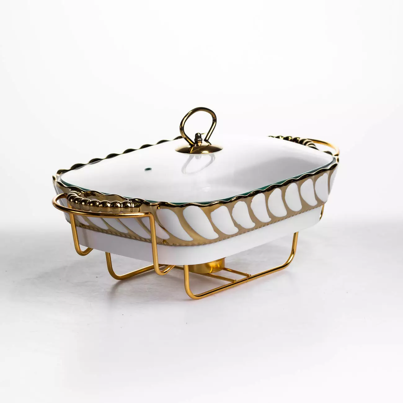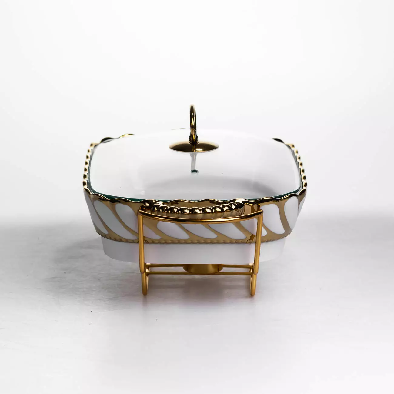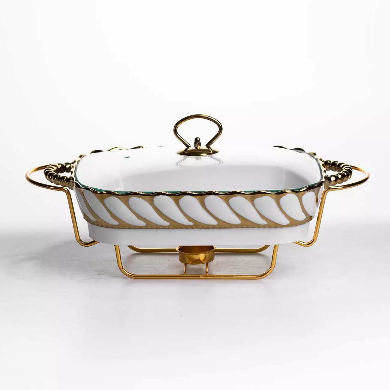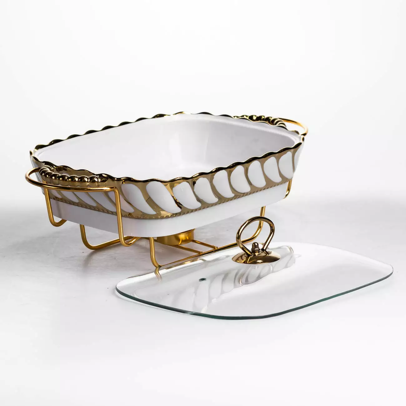 Основна ємність виготовлена з порцеляни, що забезпечує стійкість до температурних змін і простоту в догляді. Скляна кришка дозволяє контролювати вміст без необхідності відкривання, що допомагає мінімізувати втрату тепла. Металева підставка виконує функцію тримача та забезпечує місце для розміщення джерела підігріву, що рівномірно підтримує температуру страви.