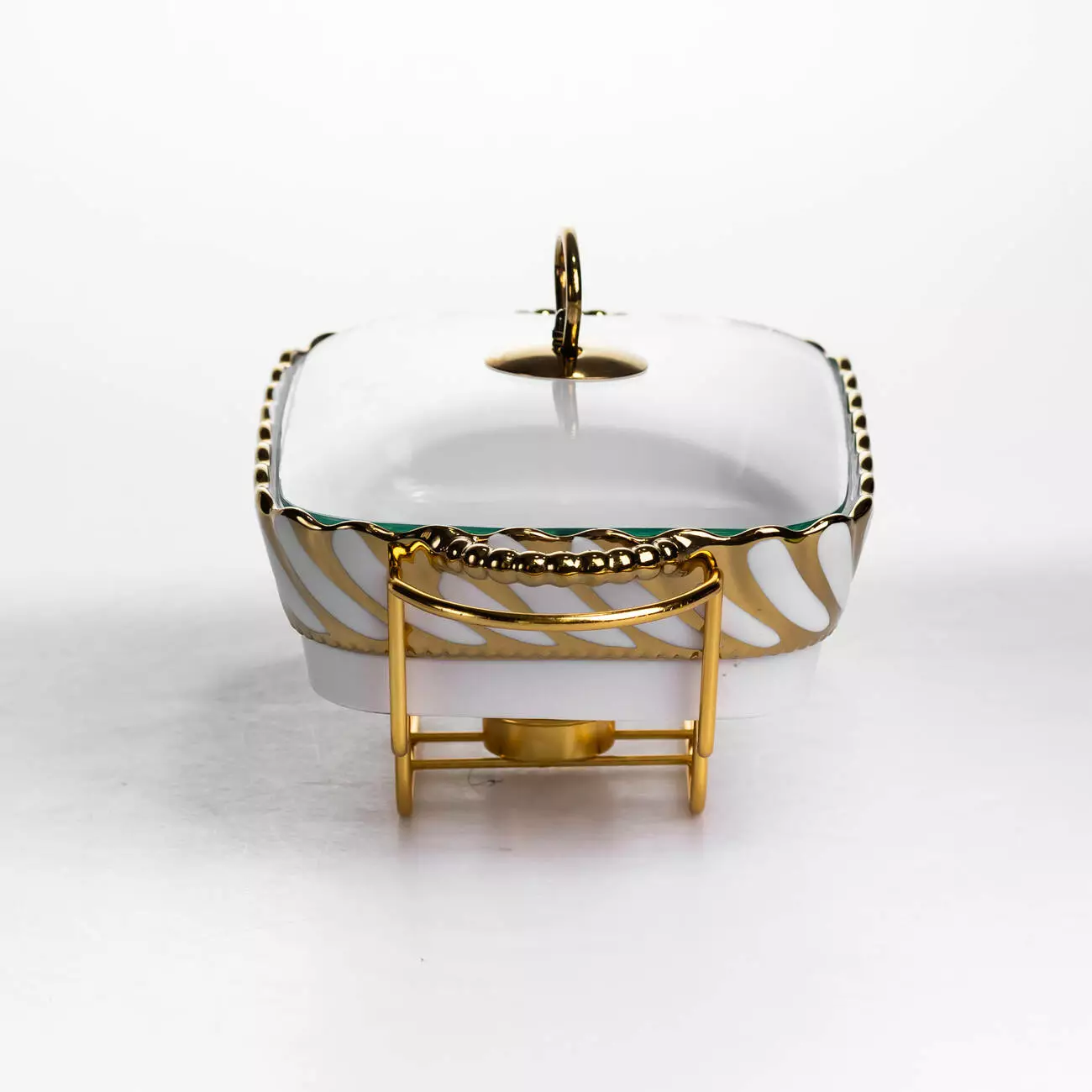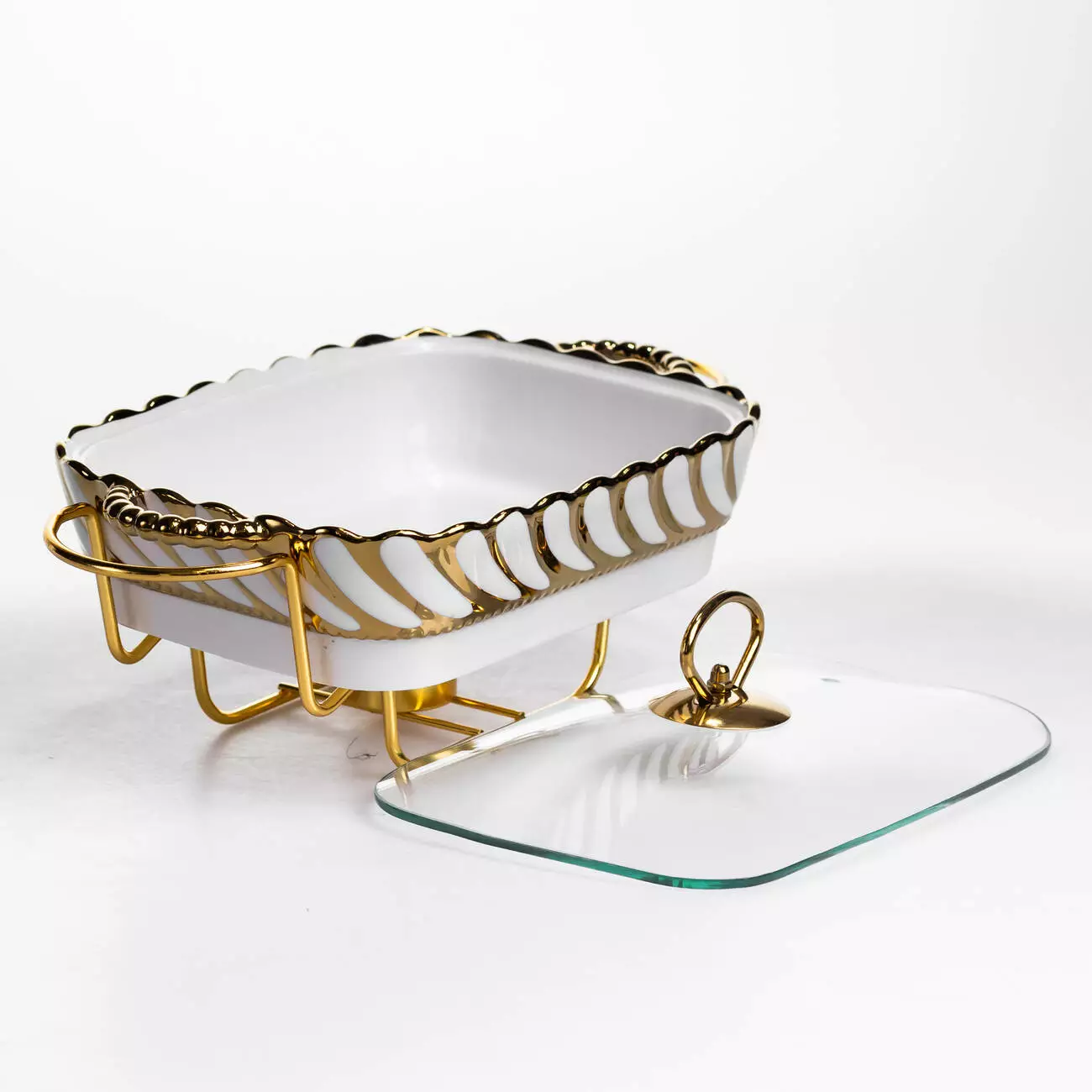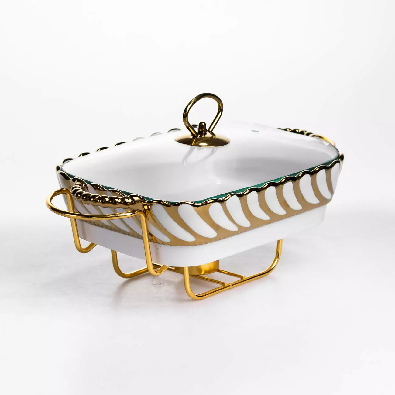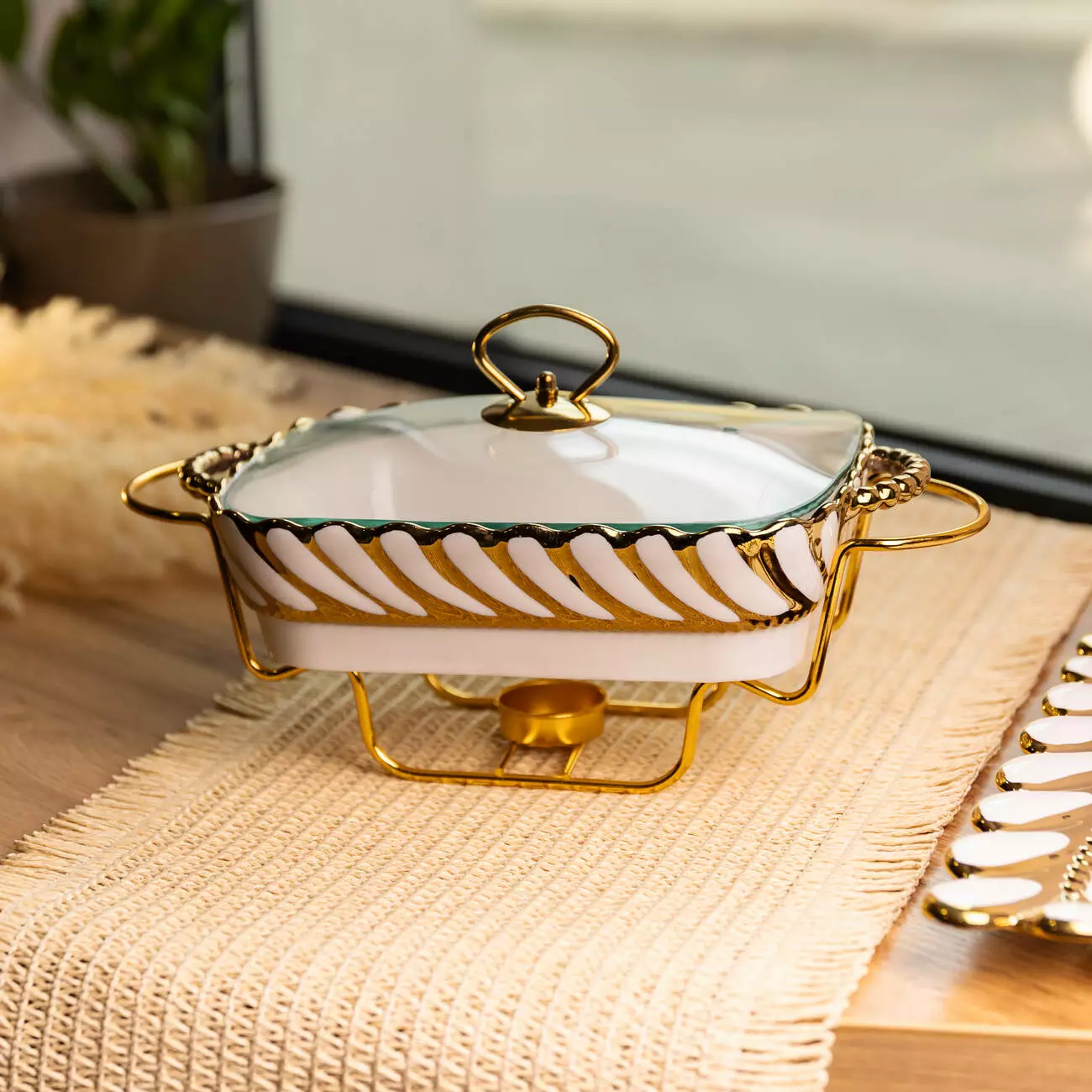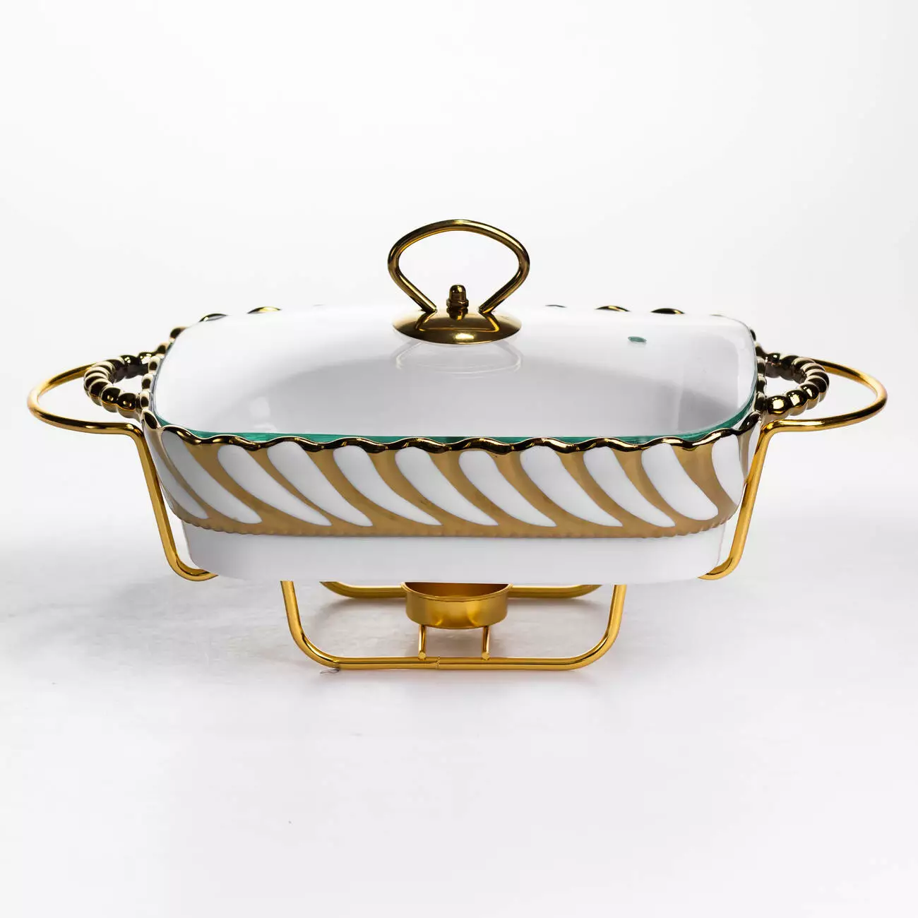 Основна ємність виготовлена з порцеляни, що забезпечує стійкість до температурних змін і простоту в догляді. Скляна кришка дозволяє контролювати вміст без необхідності відкривання, що допомагає мінімізувати втрату тепла. Металева підставка виконує функцію тримача та забезпечує місце для розміщення джерела підігріву, що рівномірно підтримує температуру страви.