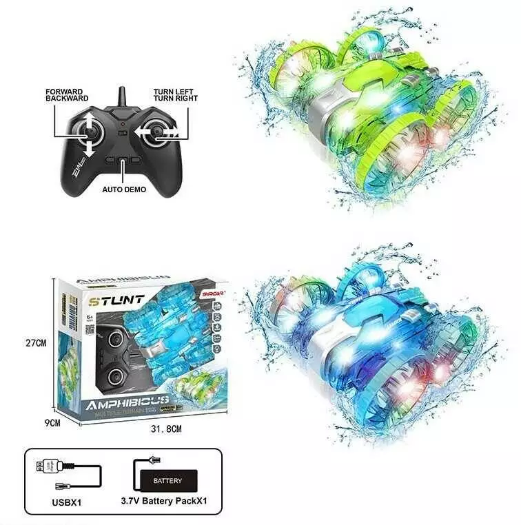 Машина на радіокеруванні 666-802 DA (36) 2 види, амфібія, розмір:14х16х7.5 см, акум.: 3.7 V, пульт: 2.4 GHz, оберт: 360°, підсвіч., в коробці, МІКС