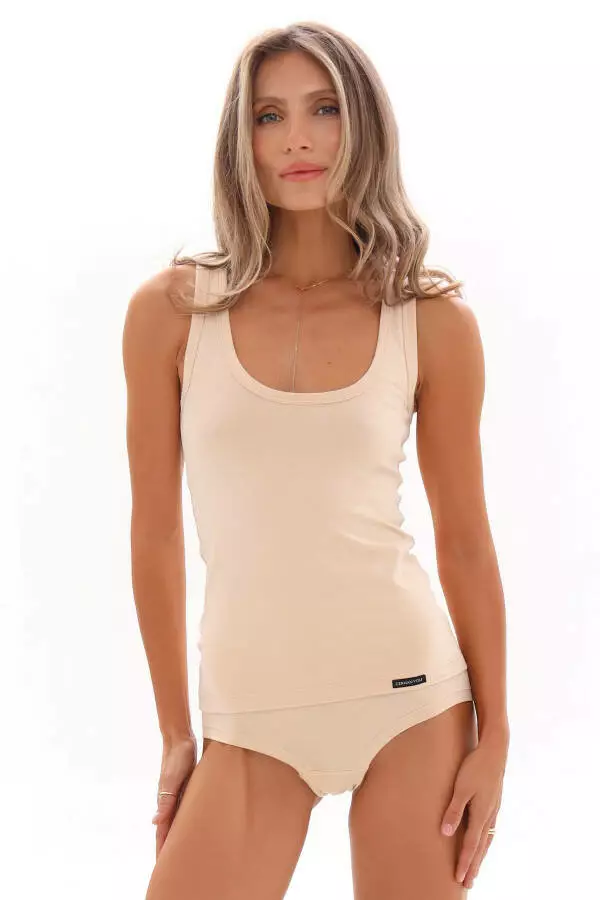 Майка базова жіноча з м’якого куліру – легка, дихаюча та максимально комфортна. Ідеально підходить як для щоденного носіння, так і як частина домашнього або нижнього одягу. Приталений силует підкреслює фігуру, а нейтральний бежевий колір легко поєднується з іншими речами. У колекції також представлені футболка, бойшортс та труси бріфи – ідеально для створення повного комплекту
