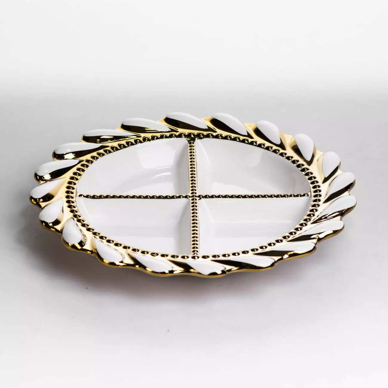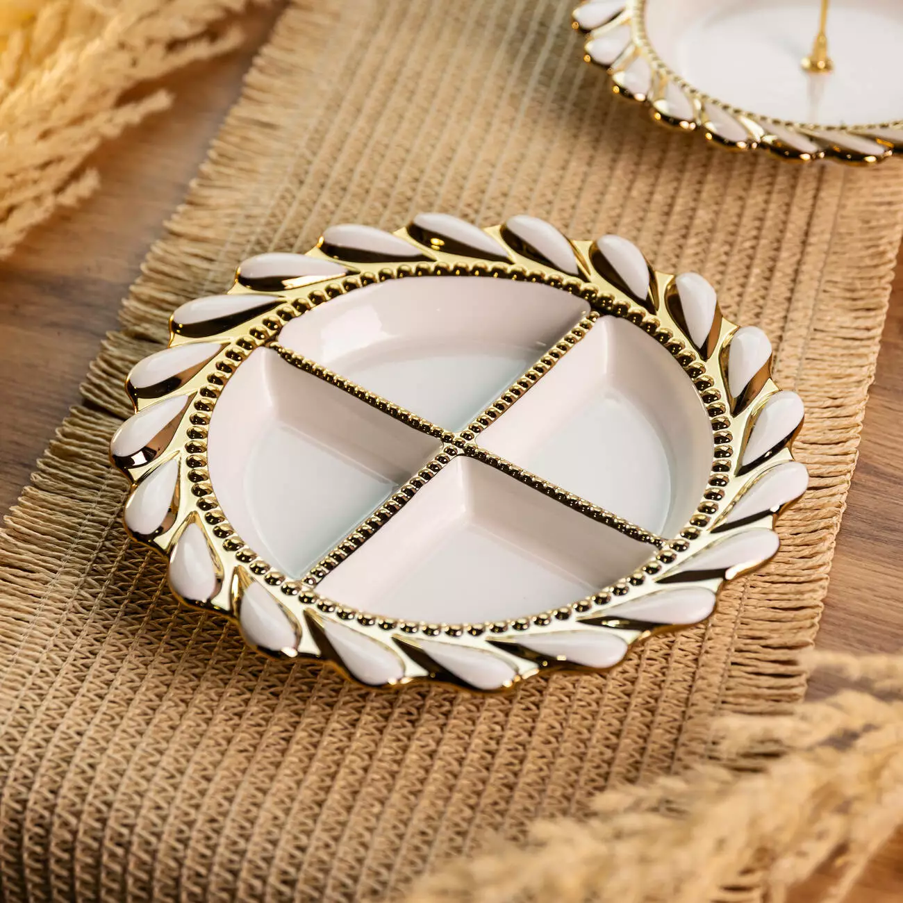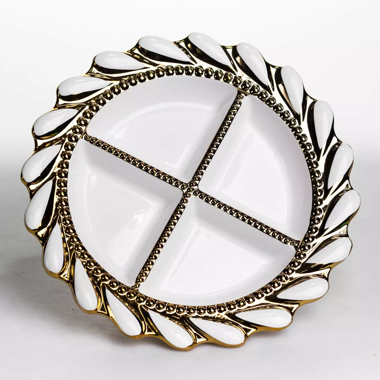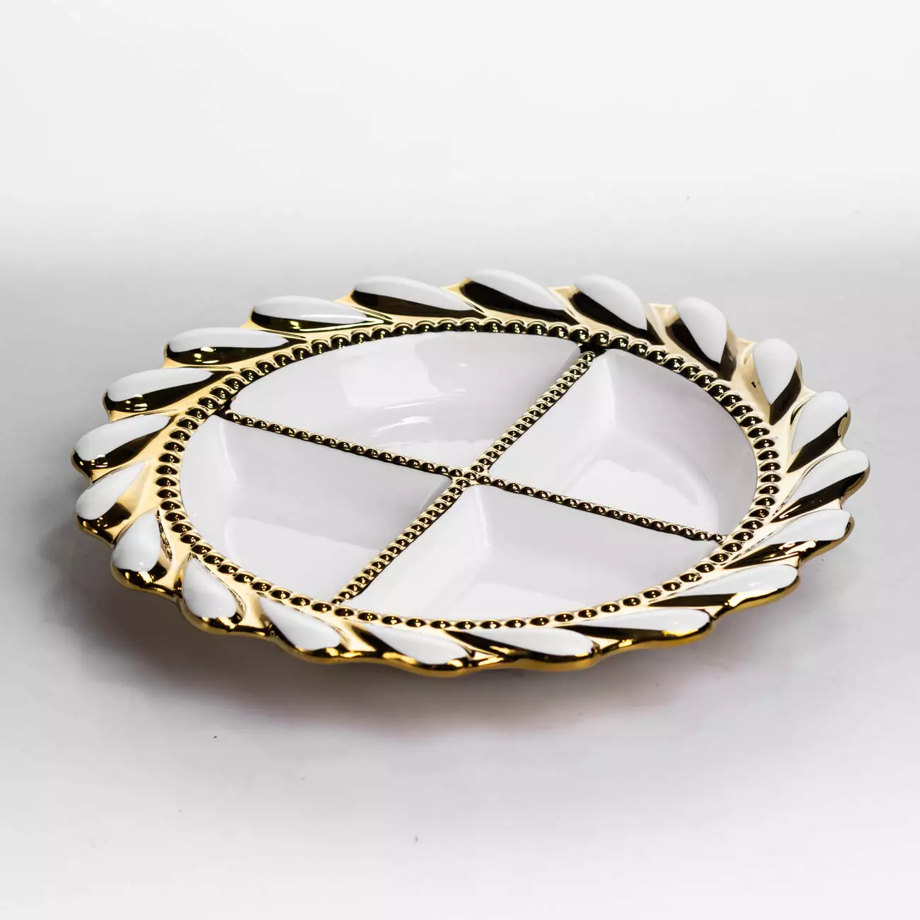 Менажниця Tiffany круглої форми діаметром 26 см призначена для зручної подачі кількох видів закусок одночасно. Розділення на 4 секції дозволяє акуратно розмістити різні продукти без змішування, що робить її практичним рішенням для сервірування столу як у домашніх умовах, так і під час заходів.