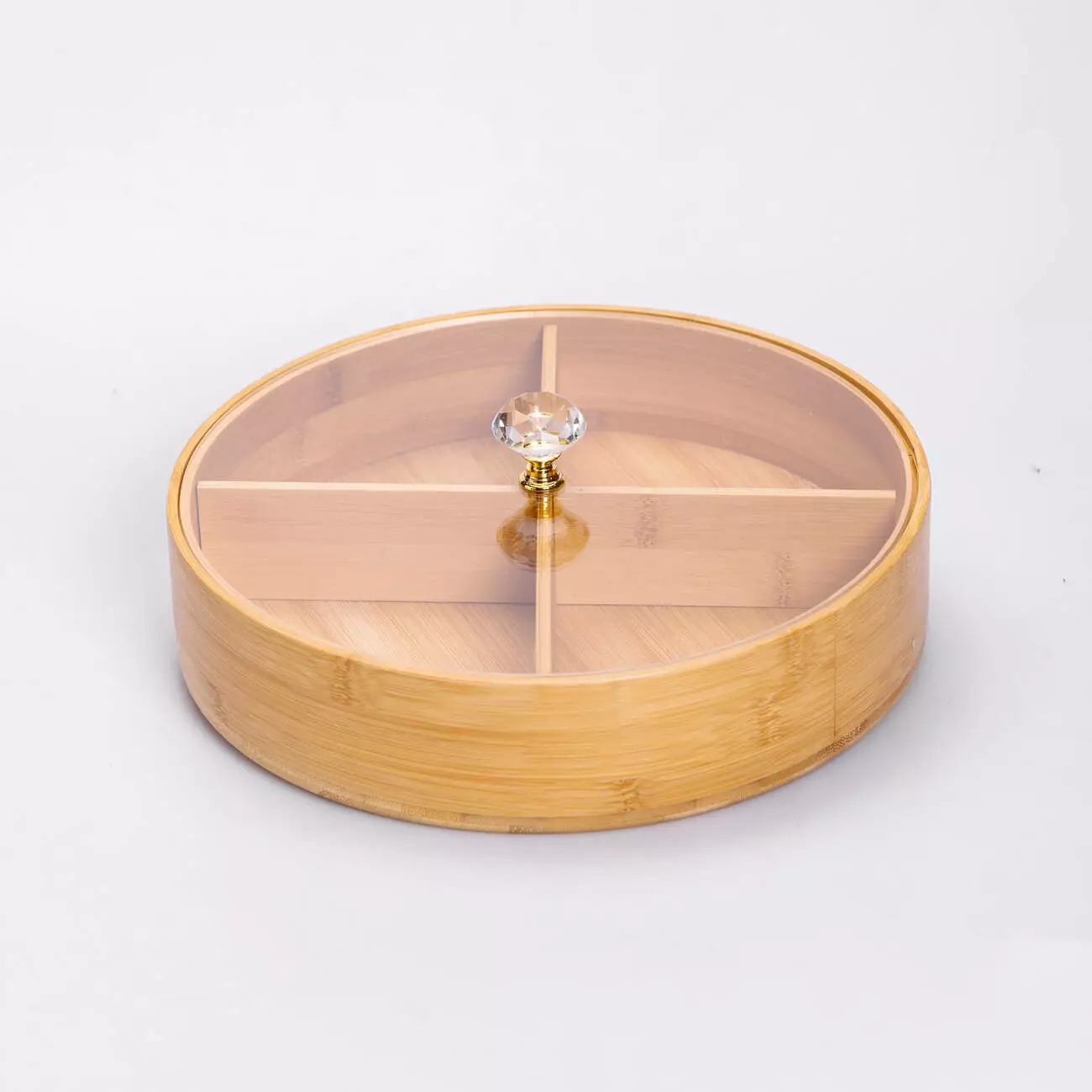 Кругла бамбукова менажниця з кришкою стане зручним і універсальним посудом для сервірування. Завдяки чотирьом секціям можна красиво подати закуски, сухофрукти, горішки чи інші смаколики, зберігаючи їх окремо. Натуральний бамбук поєднує екологічність і довговічність, а прозора пластикова кришка захищає продукти від пилу та зберігає їх свіжість.