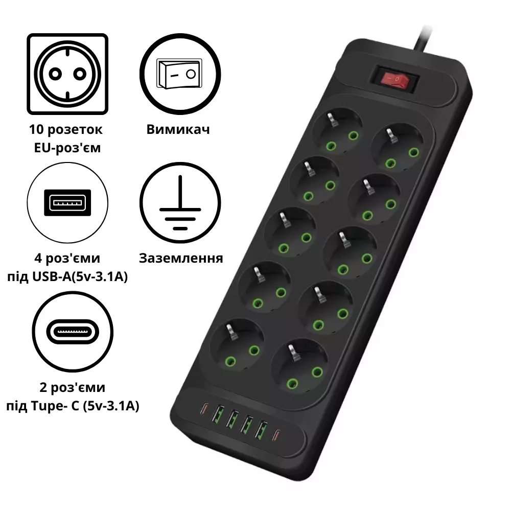 із заземленням, а також 4 USB-A і 2 Type-C портами, що дозволяє