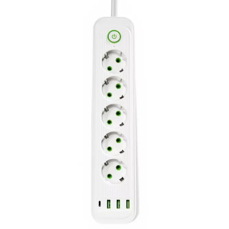 Мережевий фільтр-подовжувач із п’ятьма розетками, трьома USB-портами та одним Type-C підходить для одночасного підключення побутової техніки й заряджання мобільних пристроїв. Формат 5 розеток + 3 USB + Type-C дозволяє раціонально використовувати одну точку живлення без додаткових адаптерів. Довжина кабелю 5 м забезпечує зручне підключення в межах кімнати або робочого простору.