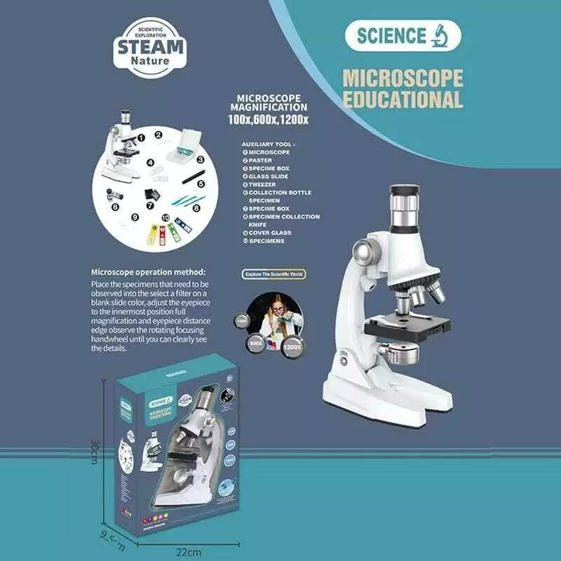 Мікроскоп 3304 (36) збільшення 100х, 600х та 1200х, інструменти, скельця, підсвічування, на батарейках, в коробці