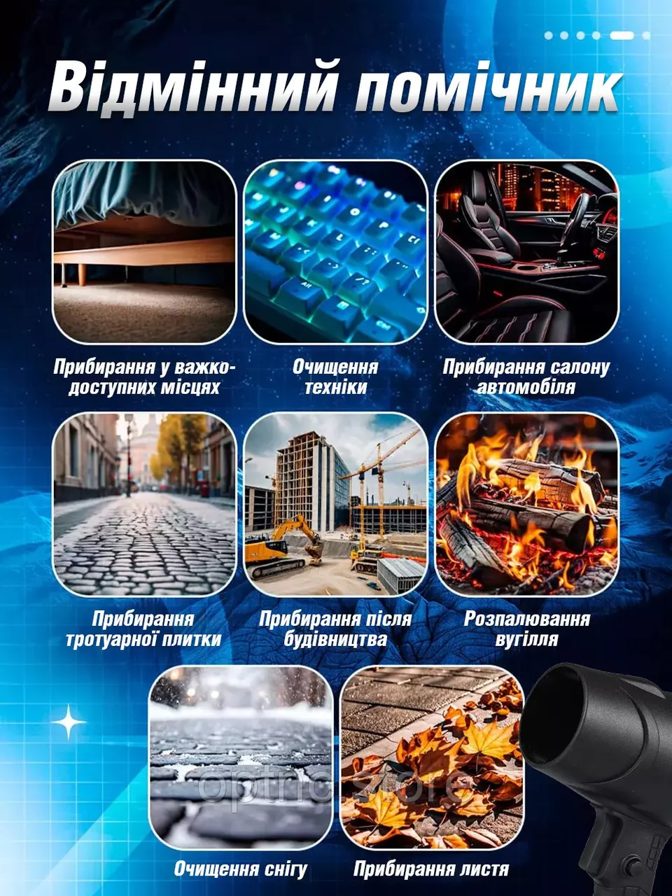 его можно использовать для удаления листьев и снега, а также для
